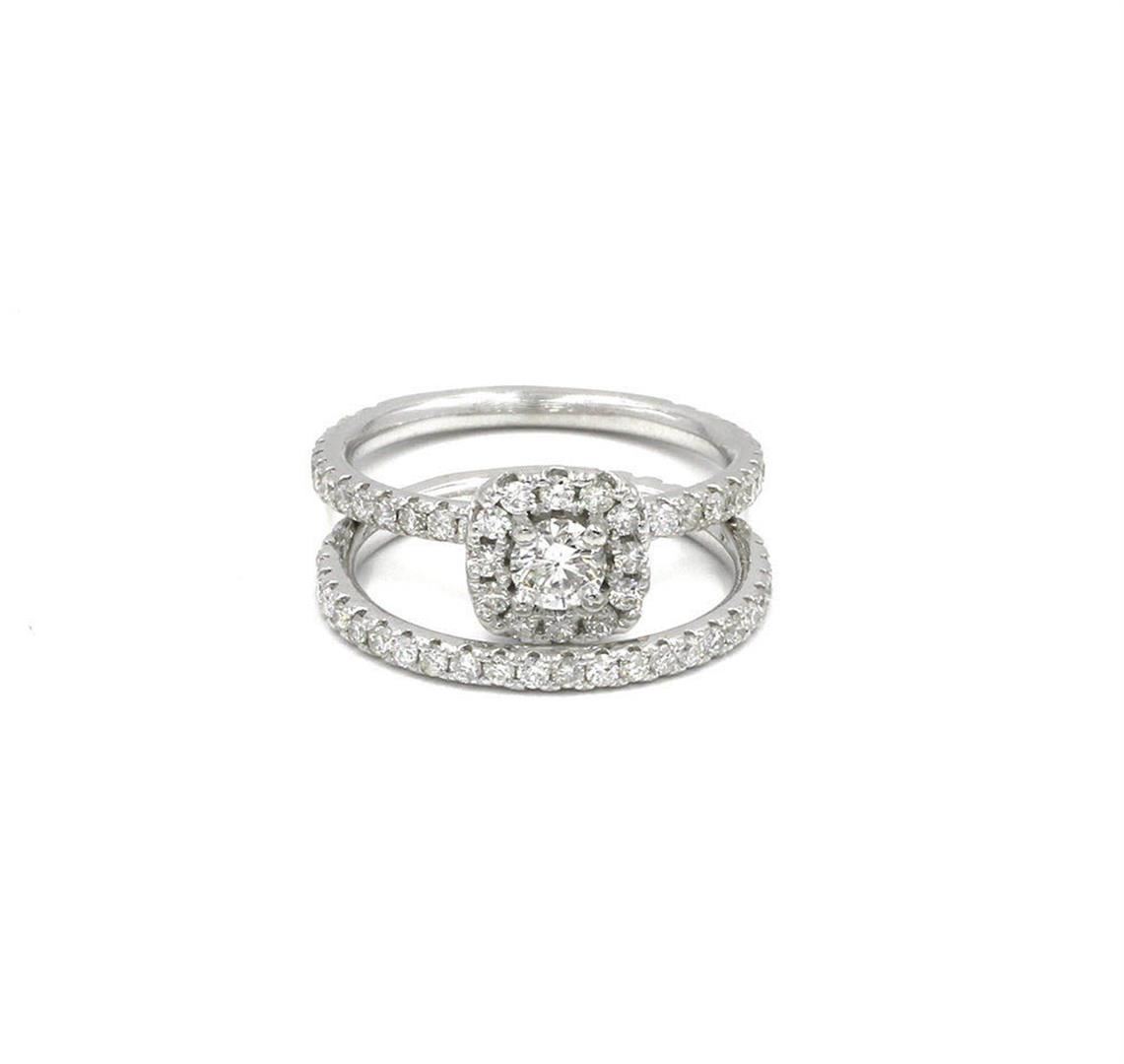 One lady's ring featuring: 14KT white gold weighing 4.75 grams containing one center diamond weighing 0.32ct and 74 side diamonds weighing 0.95ctw. The center diamond is round brilliant cut with SI1 clarity and G-H color with very good cut. The side diamo