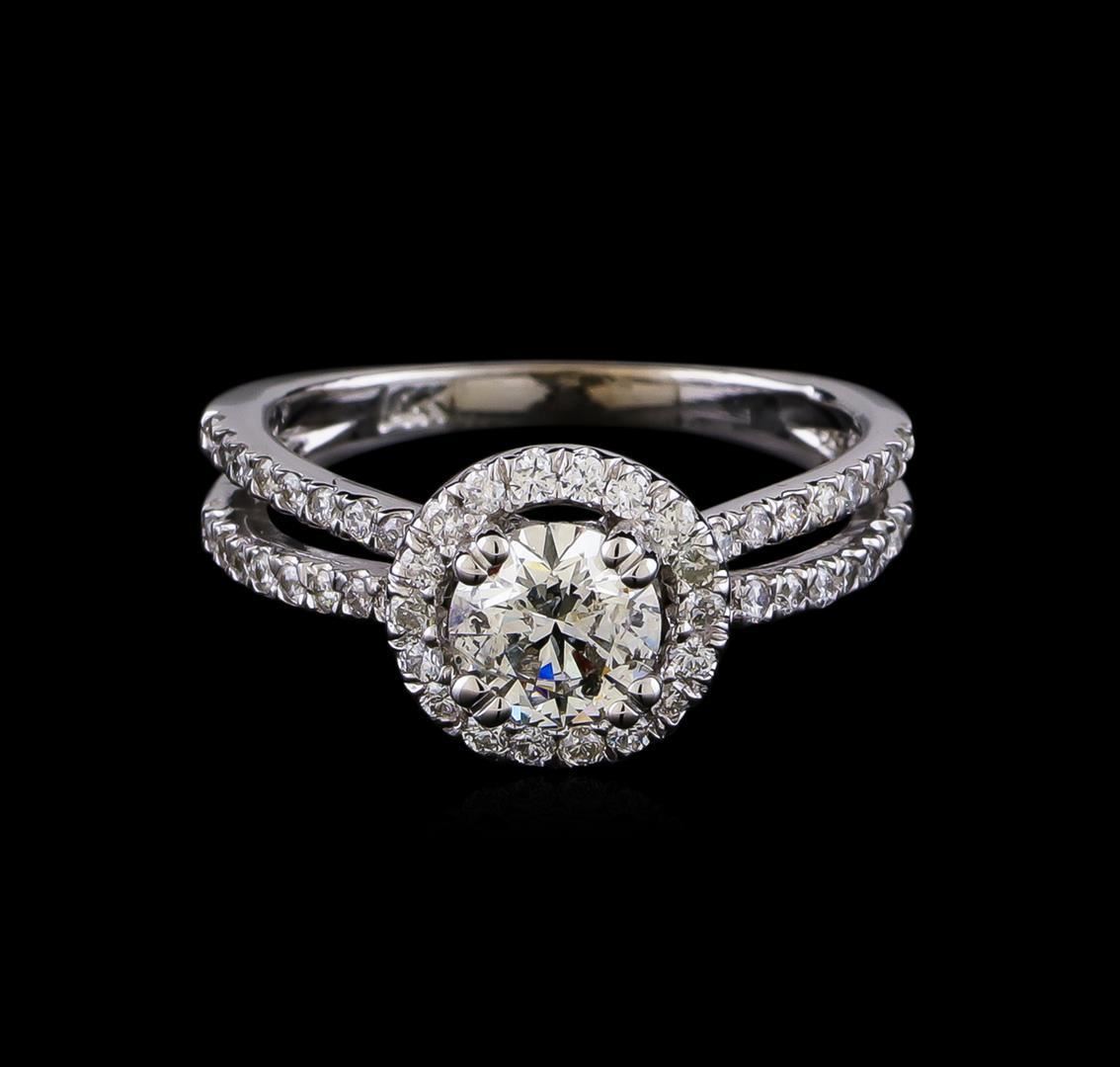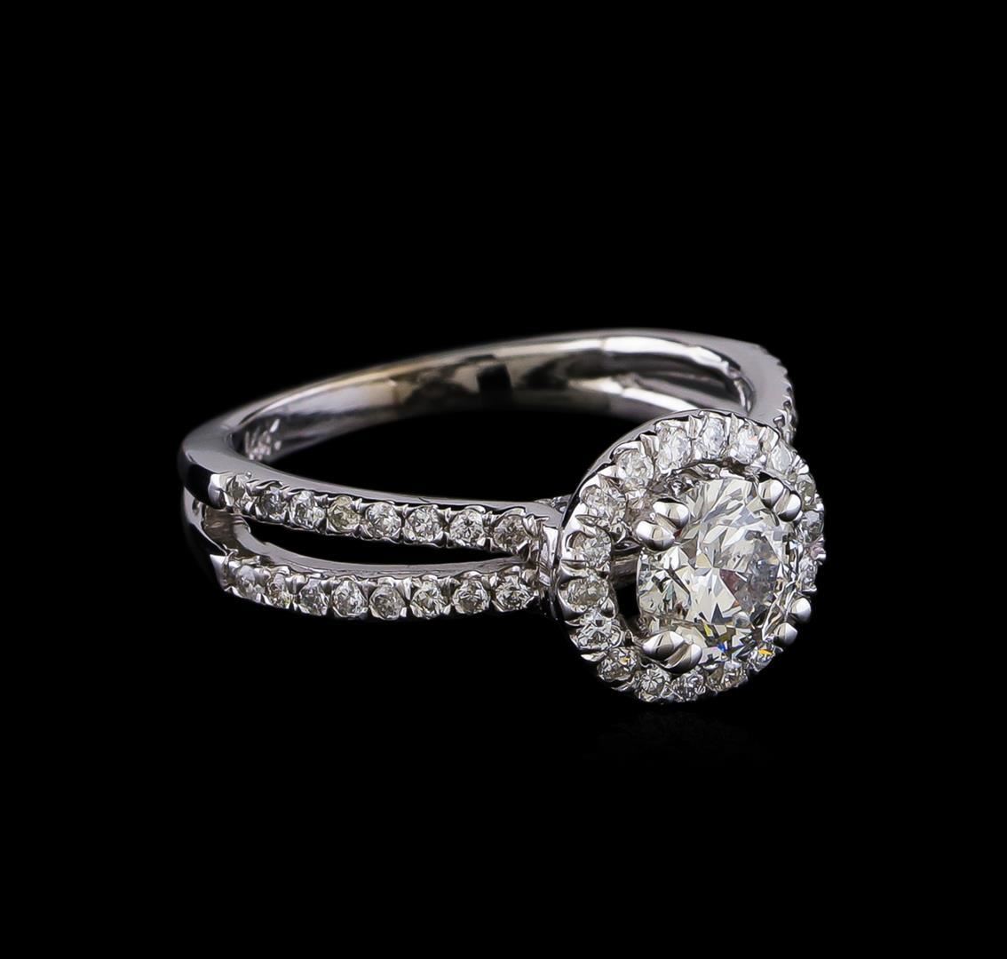 One electronically tested 14KT white gold lady's cast wedding ring with a split shank halo with a bright polish finish. The featured lady's ring has a shank measuring 2.0 millimeters in width. Identified with markings of "14K". Condition is new, good workmanship. Containing: One prong set round brilliant cut diamond, measuring 5.93 - 5.91 x 3.67mm (depth est.) approximate weight of 0.78ct. Graded in the setting. Clarity: SI-3. Color: Good Eighteen prong set round brilliant cut diamonds, measuring 1.40 - 1.30 x 0.84mm (depth est.) approximate total weight of 18 Stones = 0.18ct. Graded in the setting. Clarity: VS-2 to SI-2. Color: G - Good Forty prong set round brilliant cut diamonds, measuring 1.30 - 1.25 x 0.80mm (depth est.) approximate total weight of 40 Stones = 0.31ct. Graded in the setting. Clarity: SI-1 to SI-2. Color: G - I. Cut Good. Total Weight of Diamonds 1.27ct. Total Weight of Ring 3.30gm. GAS Appraised.