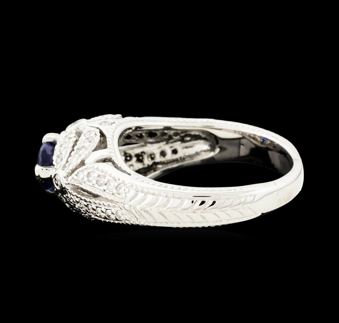 One electronically tested 14KT white gold lady's cast vintage style fashion ring with a tapered cathedral shank with a bright polish with milgrain detailing finish. The featured lady's ring has a shank measuring 2.87 millimeters wide. Identified with markings of '14K'. Condition is new, good workmanship. Containing: One prong set oval modified mixed cut natural blue sapphire, measuring 7.10 x 5.20 x 3.73mm, (depth est.) 5%. bulge factor, approximate weight of 1.27ct., clarity is slightly included, medium dark, moderately strong, blue color, (GIA B 6/4), cut is good. Transmitting light with a minimum of distortion, transparent. Colored gemstones are presumed to have been subjected to commonly used enhancement processes. Graded in the setting. Four bezel set round brilliant cut diamonds, measuring 1.60 - 1.50 x 0.96mm (depth est.) approximate total weight of 4 Stones = 0.06ct. Graded in the setting. Clarity VS-2 to SI-1. Color: G - H Cut Very Good Forty-Six prong set round brilliant cut diamonds, measuring 1.40 - 1.30 x 0.84mm (depth est.) approximate total weight of 46 Stones = 0.44ct. Graded in the setting. Clarity VS-2 to SI-1. Color: G - I Cut Good. Total Weight of Colored Stones 1.27ct.. Total Weight of Diamonds 0.50ct.. Total Weight of Ring 7.70gm. GAS Appraised at $5,470.00.