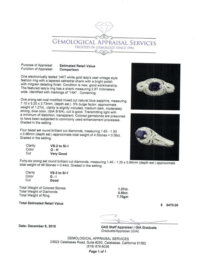 One electronically tested 14KT white gold lady's cast vintage style fashion ring with a tapered cathedral shank with a bright polish with milgrain detailing finish. The featured lady's ring has a shank measuring 2.87 millimeters wide. Identified with markings of '14K'. Condition is new, good workmanship. Containing: One prong set oval modified mixed cut natural blue sapphire, measuring 7.10 x 5.20 x 3.73mm, (depth est.) 5%. bulge factor, approximate weight of 1.27ct., clarity is slightly included, medium dark, moderately strong, blue color, (GIA B 6/4), cut is good. Transmitting light with a minimum of distortion, transparent. Colored gemstones are presumed to have been subjected to commonly used enhancement processes. Graded in the setting. Four bezel set round brilliant cut diamonds, measuring 1.60 - 1.50 x 0.96mm (depth est.) approximate total weight of 4 Stones = 0.06ct. Graded in the setting. Clarity VS-2 to SI-1. Color: G - H Cut Very Good Forty-Six prong set round brilliant cut diamonds, measuring 1.40 - 1.30 x 0.84mm (depth est.) approximate total weight of 46 Stones = 0.44ct. Graded in the setting. Clarity VS-2 to SI-1. Color: G - I Cut Good. Total Weight of Colored Stones 1.27ct.. Total Weight of Diamonds 0.50ct.. Total Weight of Ring 7.70gm. GAS Appraised at $5,470.00.