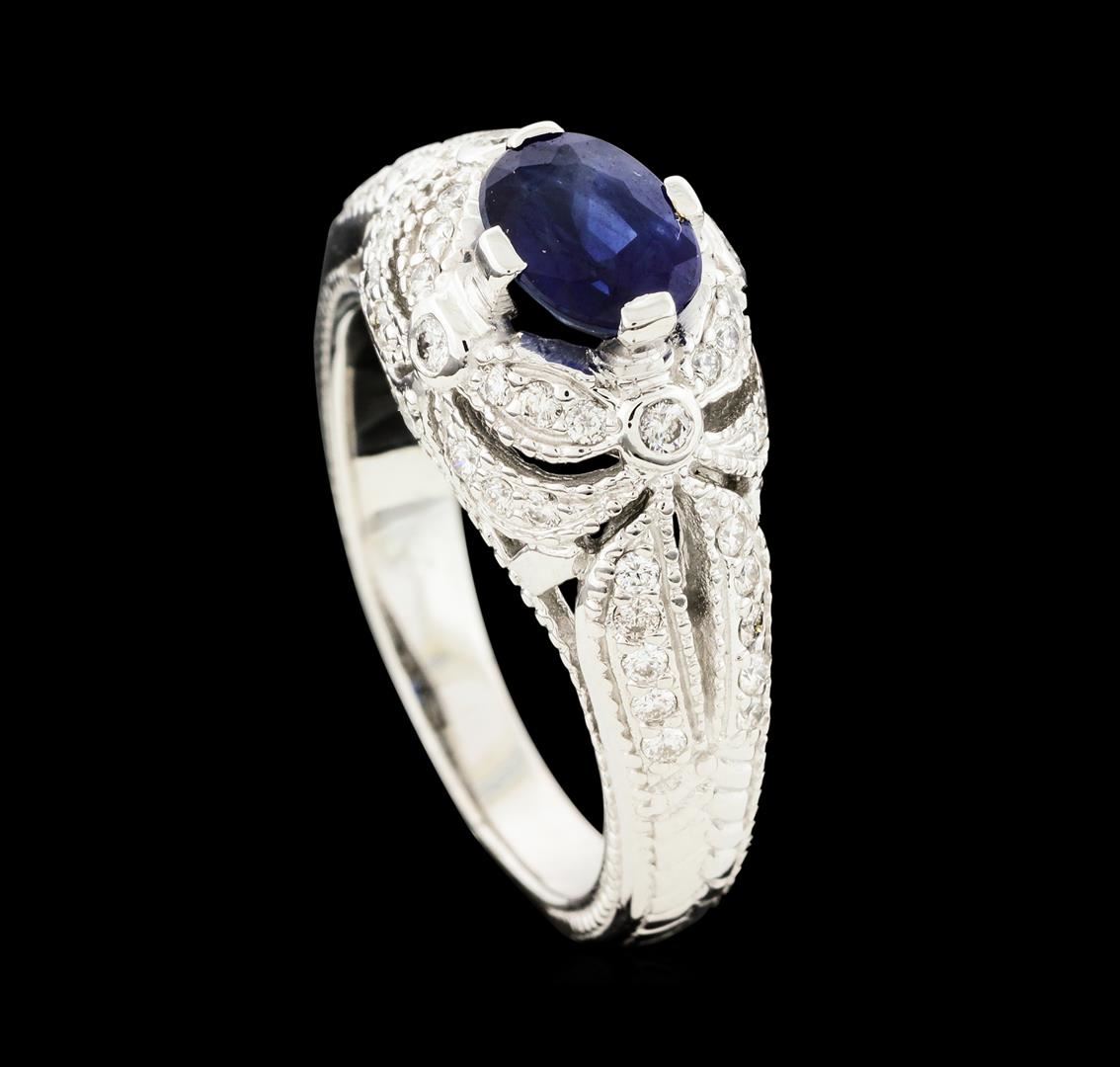 One electronically tested 14KT white gold lady's cast vintage style fashion ring with a tapered cathedral shank with a bright polish with milgrain detailing finish. The featured lady's ring has a shank measuring 2.87 millimeters wide. Identified with markings of '14K'. Condition is new, good workmanship. Containing: One prong set oval modified mixed cut natural blue sapphire, measuring 7.10 x 5.20 x 3.73mm, (depth est.) 5%. bulge factor, approximate weight of 1.27ct., clarity is slightly included, medium dark, moderately strong, blue color, (GIA B 6/4), cut is good. Transmitting light with a minimum of distortion, transparent. Colored gemstones are presumed to have been subjected to commonly used enhancement processes. Graded in the setting. Four bezel set round brilliant cut diamonds, measuring 1.60 - 1.50 x 0.96mm (depth est.) approximate total weight of 4 Stones = 0.06ct. Graded in the setting. Clarity VS-2 to SI-1. Color: G - H Cut Very Good Forty-Six prong set round brilliant cut diamonds, measuring 1.40 - 1.30 x 0.84mm (depth est.) approximate total weight of 46 Stones = 0.44ct. Graded in the setting. Clarity VS-2 to SI-1. Color: G - I Cut Good. Total Weight of Colored Stones 1.27ct.. Total Weight of Diamonds 0.50ct.. Total Weight of Ring 7.70gm. GAS Appraised at $5,470.00.