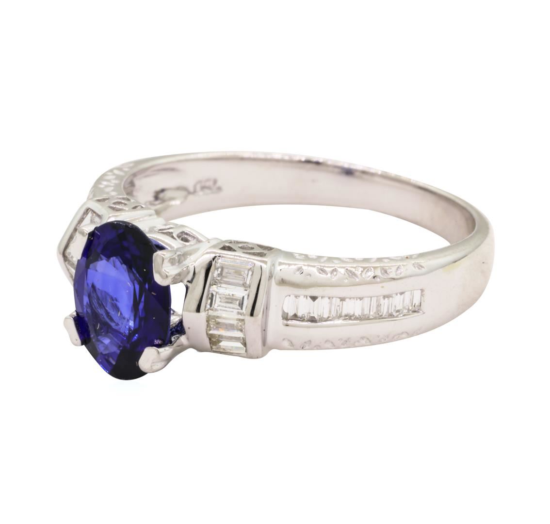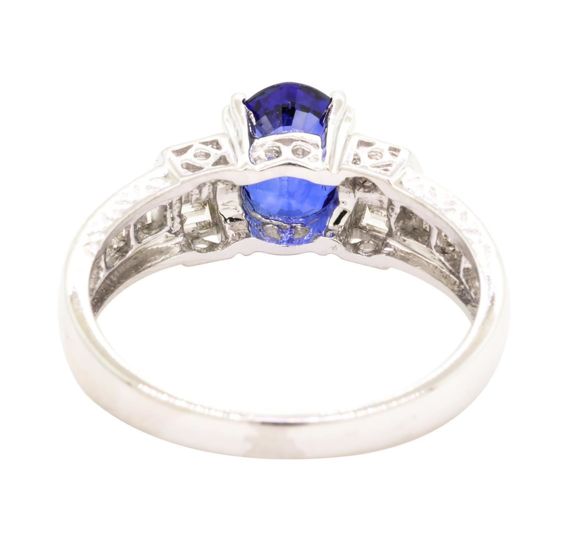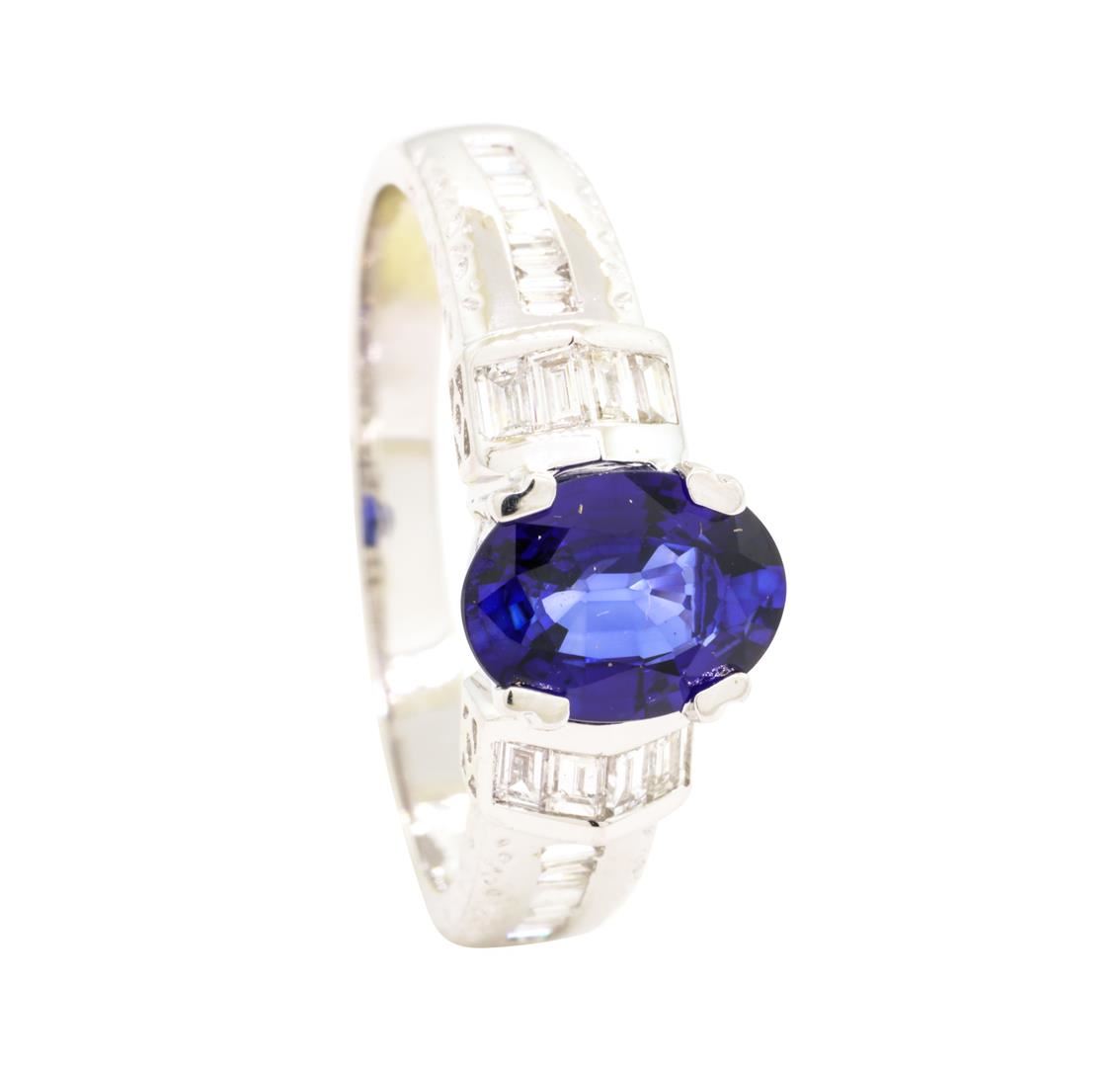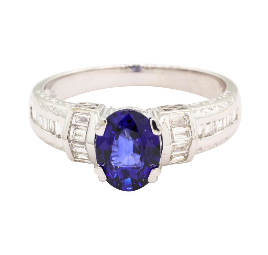 One lady's ring featuring: 18KT white gold weighing 4.0 grams containing one fine blue oval sapphire weighing 1.27ct and diamonds weighing 0.34ctw.