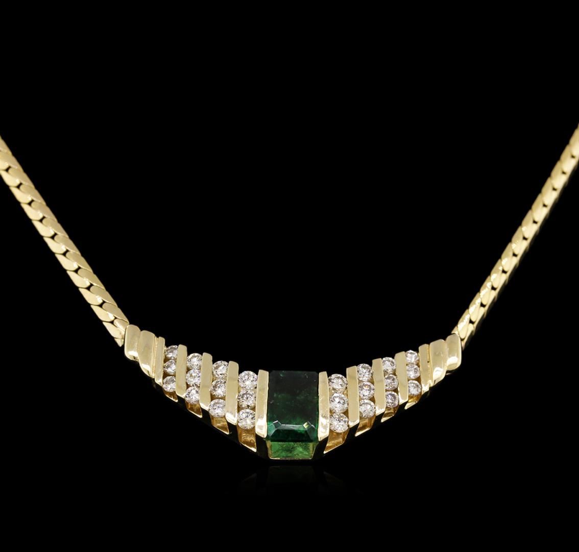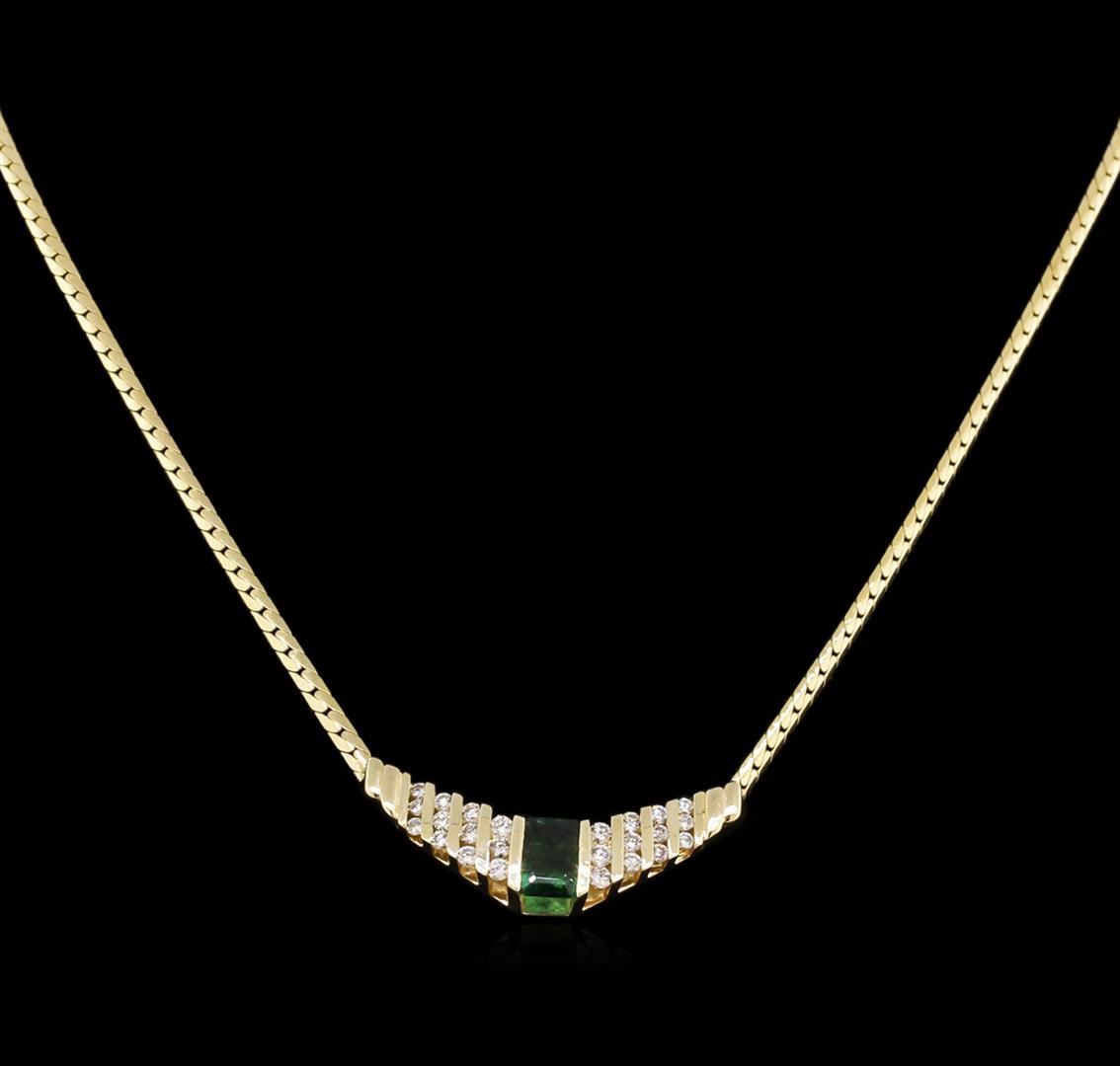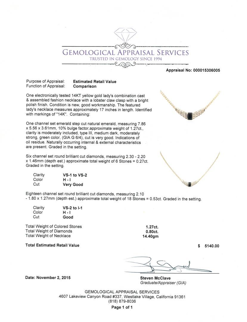 One electronically tested 14KT yellow gold lady's combination cast & assembled fashion necklace with a lobster claw clasp with a bright polish finish. The featured lady's necklace measures approximately 17 inches in length. Identified with markings of "14K". Condition is new, good workmanship. Containing: One channel set emerald step cut natural emerald, measuring 7.86 x 5.56 x 3.61mm, 10%. bulge factor, approximate weight of 1.27ct., clarity is moderately included, type III, medium dark, moderately strong, green color, (GIA G 6/4), cut is very good. Indications of oil residue. Naturally occurring internal & external characteristics are present. Graded in the setting. Six channel set round brilliant cut diamonds, measuring 2.30 - 2.20 x 1.46mm (depth est.) approximate total weight of 6 Stones = 0.27ct. Graded in the setting. Clarity: VS-1 to VS-2. Color: H - I. Cut Very Good Eighteen channel set round brilliant cut diamonds, measuring 2.10 - 1.80 x 1.27mm (depth est.) approximate total weight of 18 Stones = 0.53ct. Graded in the setting. Clarity: VS-2 to I-1. Color: H - I. Cut Good. Total Weight of Colored Stones 1.27ct. Total Weight of Diamonds 0.80ct. Total Weight of Necklace 14.40gm. GAS Appraised at $5,140.00.
