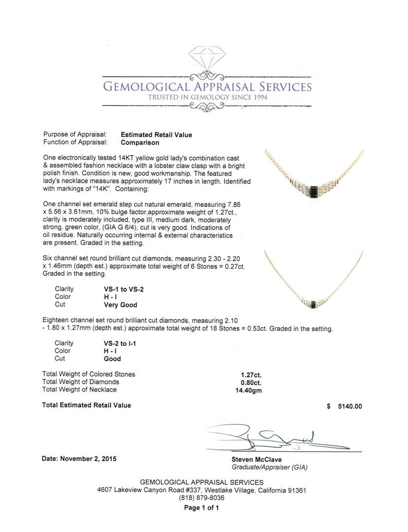 One electronically tested 14KT yellow gold lady's combination cast & assembled fashion necklace with a lobster claw clasp with a bright polish finish. The featured lady's necklace measures approximately 17 inches in length. Identified with markings of "14K". Condition is new, good workmanship. Containing: One channel set emerald step cut natural emerald, measuring 7.86 x 5.56 x 3.61mm, 10%. bulge factor, approximate weight of 1.27ct., clarity is moderately included, type III, medium dark, moderately strong, green color, (GIA G 6/4), cut is very good. Indications of oil residue. Naturally occurring internal & external characteristics are present. Graded in the setting. Six channel set round brilliant cut diamonds, measuring 2.30 - 2.20 x 1.46mm (depth est.) approximate total weight of 6 Stones = 0.27ct. Graded in the setting. Clarity: VS-1 to VS-2. Color: H - I. Cut Very Good Eighteen channel set round brilliant cut diamonds, measuring 2.10 - 1.80 x 1.27mm (depth est.) approximate total weight of 18 Stones = 0.53ct. Graded in the setting. Clarity: VS-2 to I-1. Color: H - I. Cut Good. Total Weight of Colored Stones 1.27ct. Total Weight of Diamonds 0.80ct. Total Weight of Necklace 14.40gm. GAS Appraised at $5,140.00.