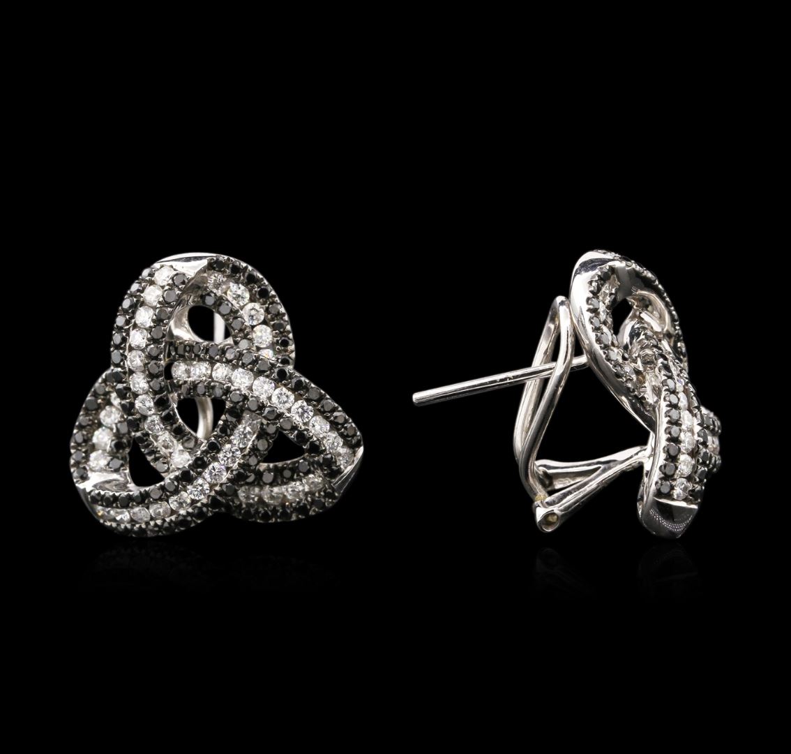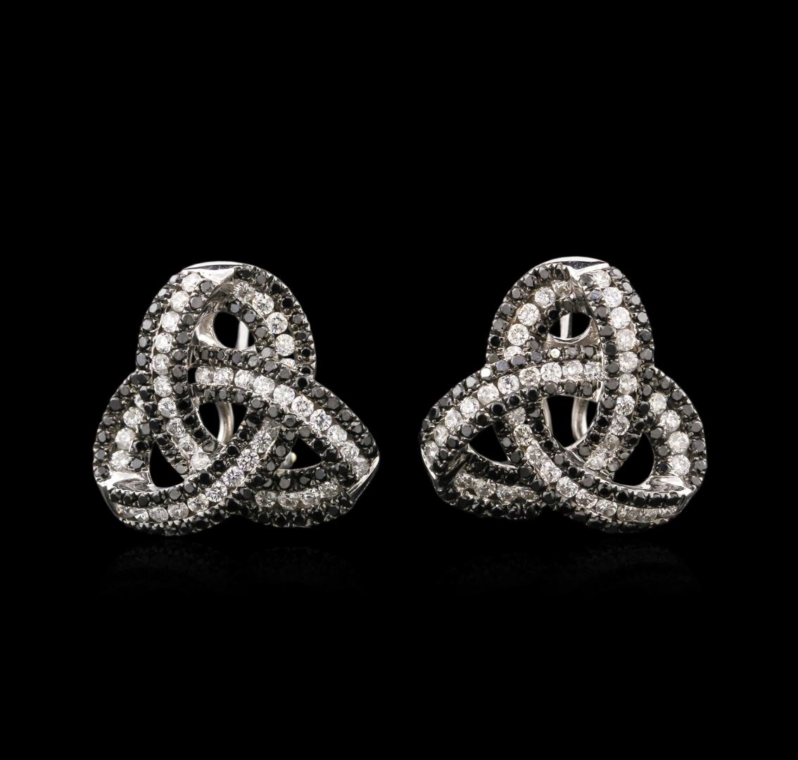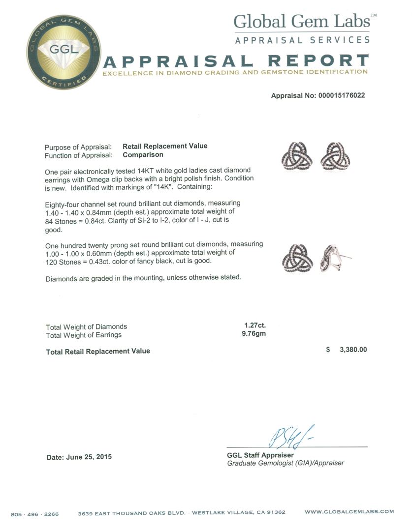 One pair electronically tested 14KT white gold ladies cast diamond earrings with Omega clip backs with a bright polish finish. Identified with markings of "14K". Condition is new. Containing: Eighty-Four channel set round brilliant cut diamonds, measuring 1.40 - 1.40 x 0.84mm (depth est.) approximate. Total Weight of 84 Stones = 0.84ct. Clarity: SI-2 to I-2. Color: I - J, Cut is Good. One Hundred Twenty prong set round brilliant cut diamonds, measuring 1.00 - 1.00 x 0.60mm (depth est.) approximate. Total Weight of 120 Stones = 0.43ct. Cut is Good. Diamonds are graded in the mounting, unless otherwise stated. Total Weight of Diamonds 1.27ct. Total Weight of Earrings 9.76 grams. GGL Appraised at $3,380.00.