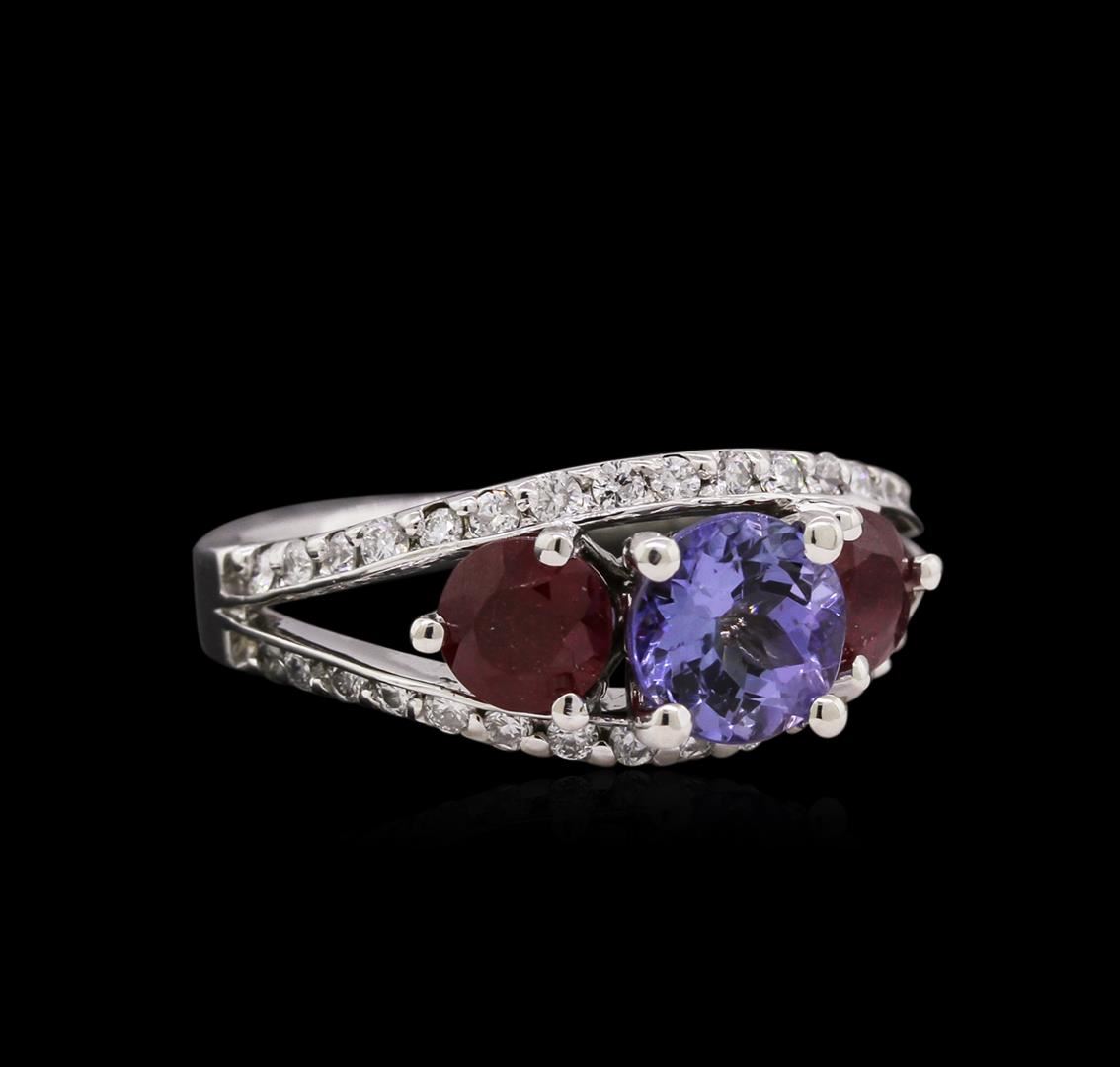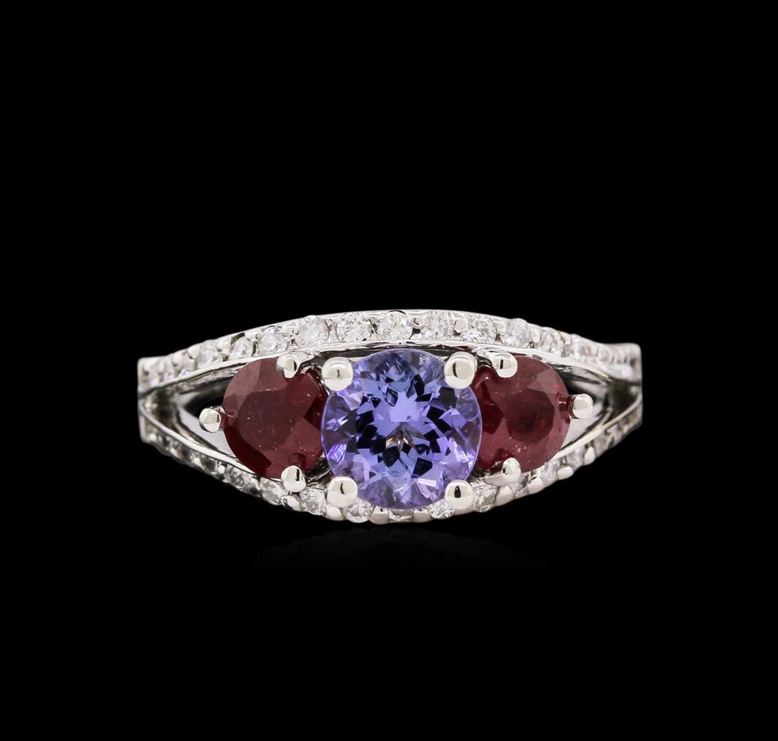 One ring featuring: 14KT white gold weighing 5.30 grams containing one tanzanite with a total weight of 1.12ct and 2 rubies with a total weight of 1.27ct and side diamonds with a total weight of 0.42ct.