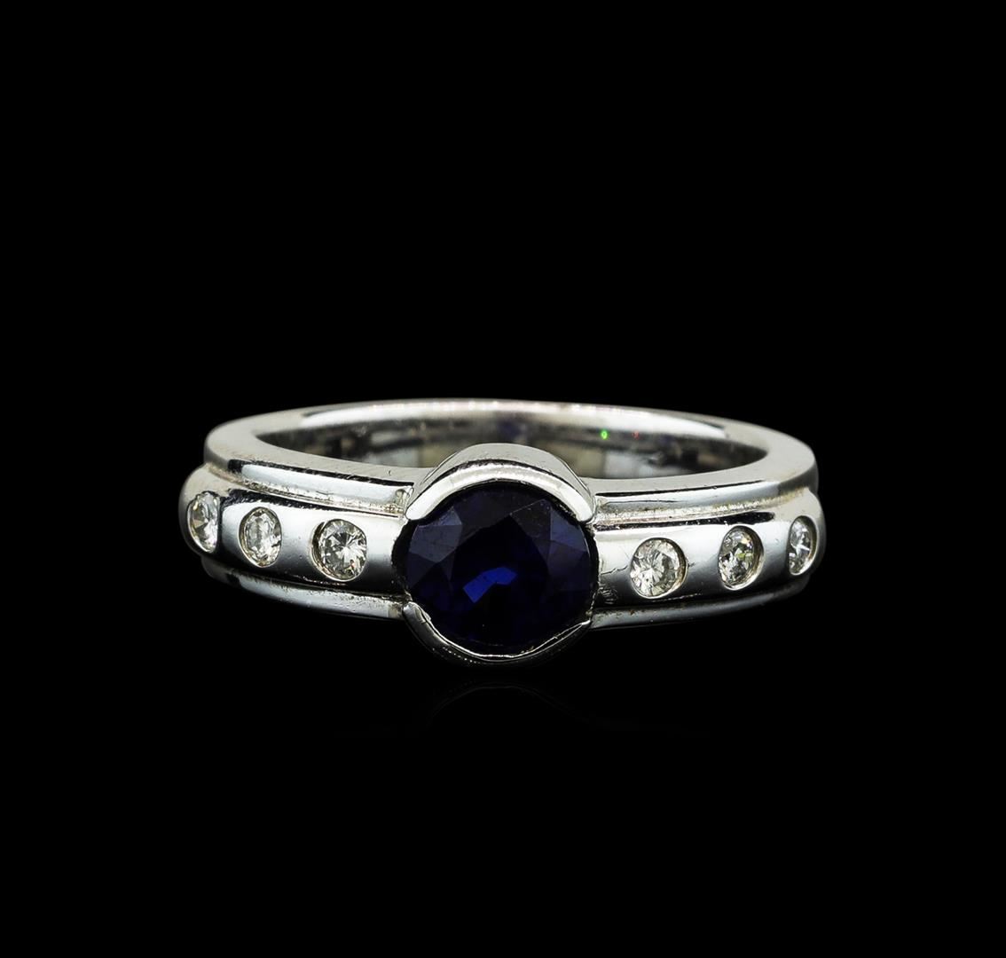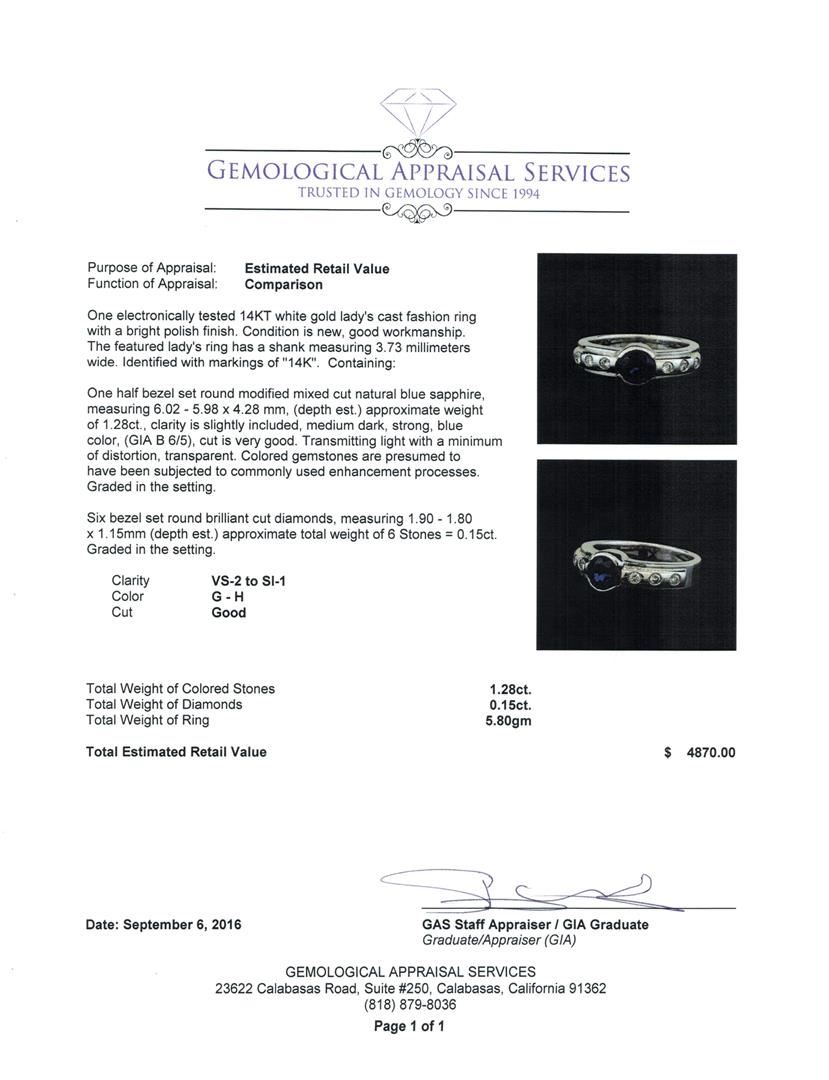 One electronically tested 14KT white gold lady's cast fashion ring with a bright polish finish. The featured lady's ring has a shank measuring 3.73 millimeters wide. Identified with markings of '14K'. Condition is new, good workmanship. Containing: One half bezel set round modified mixed cut natural blue sapphire, measuring 6.02 - 5.98 x 4.28 mm, (depth est.) approximate weight of 1.28ct., clarity is slightly included, medium dark, strong, blue color, (GIA B 6/5), cut is very good. Transmitting light with a minimum of distortion, transparent. Colored gemstones are presumed to have been subjected to commonly used enhancement processes. Graded in the setting. Six bezel set round brilliant cut diamonds, measuring 1.90 - 1.80 x 1.15mm (depth est.) approximate total weight of 6 Stones = 0.15ct. Graded in the setting. Clarity VS-2 to SI-1. Color: G - H Cut Good. Total Weight of Colored Stones 1.28ct.. Total Weight of Diamonds 0.15ct.. Total Weight of Ring 5.80gm GAS Appraised at $4,870.00.