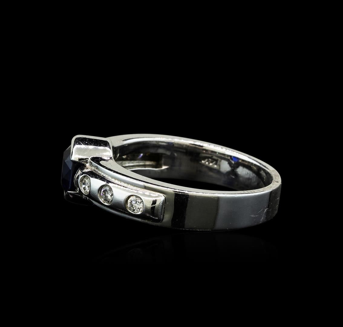 One electronically tested 14KT white gold lady's cast fashion ring with a bright polish finish. The featured lady's ring has a shank measuring 3.73 millimeters wide. Identified with markings of '14K'. Condition is new, good workmanship. Containing: One half bezel set round modified mixed cut natural blue sapphire, measuring 6.02 - 5.98 x 4.28 mm, (depth est.) approximate weight of 1.28ct., clarity is slightly included, medium dark, strong, blue color, (GIA B 6/5), cut is very good. Transmitting light with a minimum of distortion, transparent. Colored gemstones are presumed to have been subjected to commonly used enhancement processes. Graded in the setting. Six bezel set round brilliant cut diamonds, measuring 1.90 - 1.80 x 1.15mm (depth est.) approximate total weight of 6 Stones = 0.15ct. Graded in the setting. Clarity VS-2 to SI-1. Color: G - H Cut Good. Total Weight of Colored Stones 1.28ct.. Total Weight of Diamonds 0.15ct.. Total Weight of Ring 5.80gm GAS Appraised at $4,870.00.