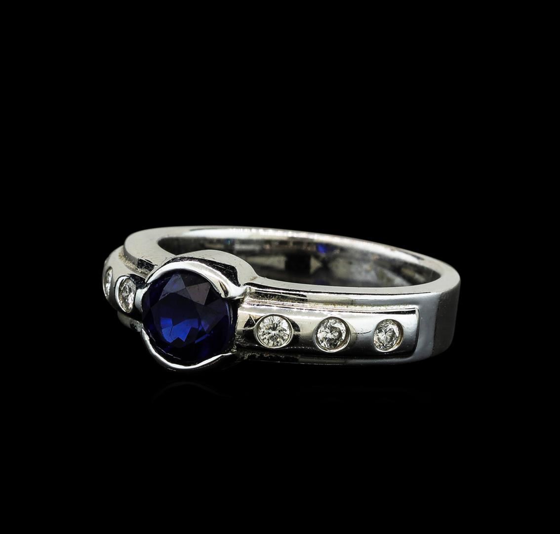One electronically tested 14KT white gold lady's cast fashion ring with a bright polish finish. The featured lady's ring has a shank measuring 3.73 millimeters wide. Identified with markings of '14K'. Condition is new, good workmanship. Containing: One half bezel set round modified mixed cut natural blue sapphire, measuring 6.02 - 5.98 x 4.28 mm, (depth est.) approximate weight of 1.28ct., clarity is slightly included, medium dark, strong, blue color, (GIA B 6/5), cut is very good. Transmitting light with a minimum of distortion, transparent. Colored gemstones are presumed to have been subjected to commonly used enhancement processes. Graded in the setting. Six bezel set round brilliant cut diamonds, measuring 1.90 - 1.80 x 1.15mm (depth est.) approximate total weight of 6 Stones = 0.15ct. Graded in the setting. Clarity VS-2 to SI-1. Color: G - H Cut Good. Total Weight of Colored Stones 1.28ct.. Total Weight of Diamonds 0.15ct.. Total Weight of Ring 5.80gm GAS Appraised at $4,870.00.