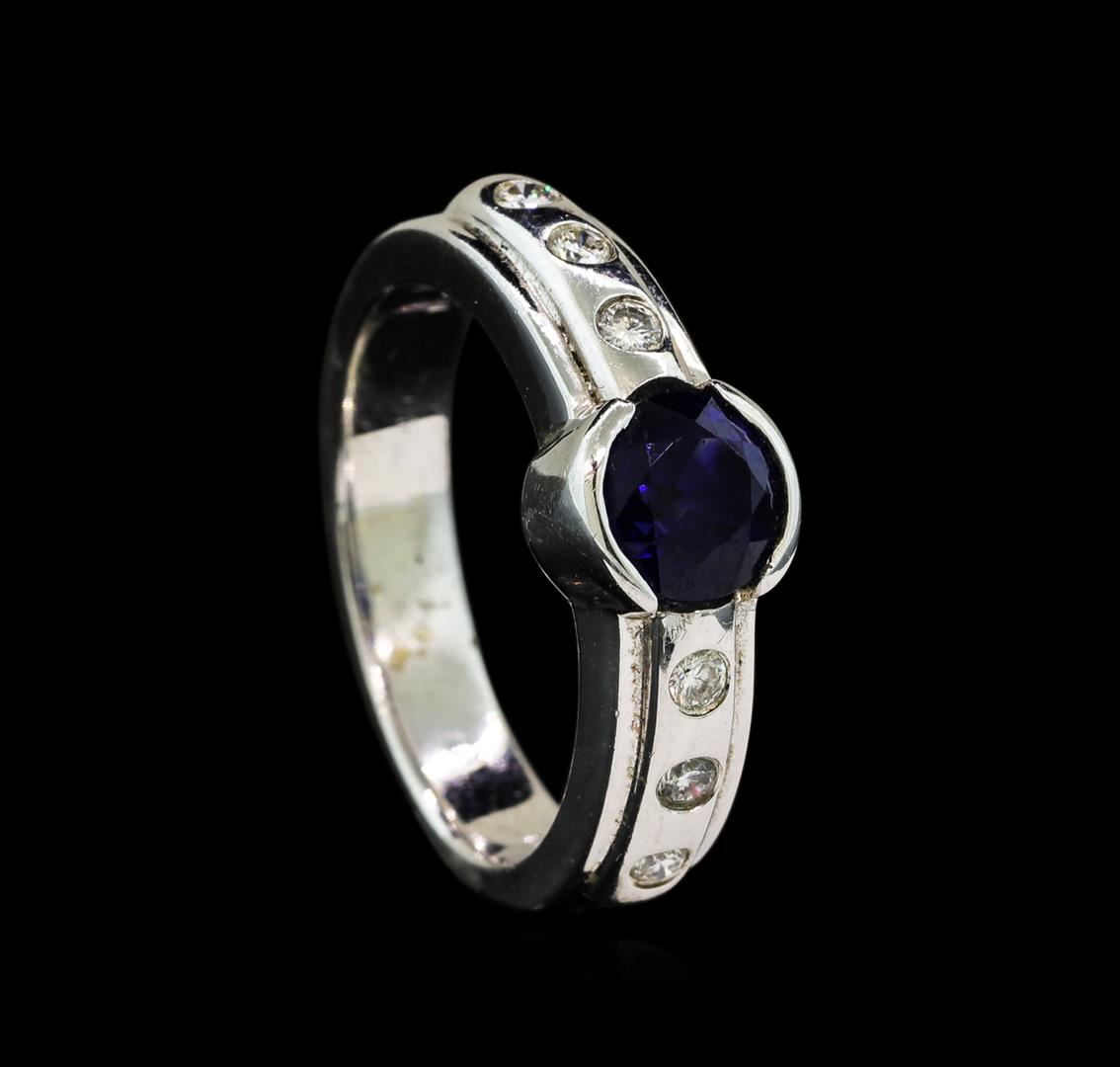 One electronically tested 14KT white gold lady's cast fashion ring with a bright polish finish. The featured lady's ring has a shank measuring 3.73 millimeters wide. Identified with markings of '14K'. Condition is new, good workmanship. Containing: One half bezel set round modified mixed cut natural blue sapphire, measuring 6.02 - 5.98 x 4.28 mm, (depth est.) approximate weight of 1.28ct., clarity is slightly included, medium dark, strong, blue color, (GIA B 6/5), cut is very good. Transmitting light with a minimum of distortion, transparent. Colored gemstones are presumed to have been subjected to commonly used enhancement processes. Graded in the setting. Six bezel set round brilliant cut diamonds, measuring 1.90 - 1.80 x 1.15mm (depth est.) approximate total weight of 6 Stones = 0.15ct. Graded in the setting. Clarity VS-2 to SI-1. Color: G - H Cut Good. Total Weight of Colored Stones 1.28ct.. Total Weight of Diamonds 0.15ct.. Total Weight of Ring 5.80gm GAS Appraised at $4,870.00.