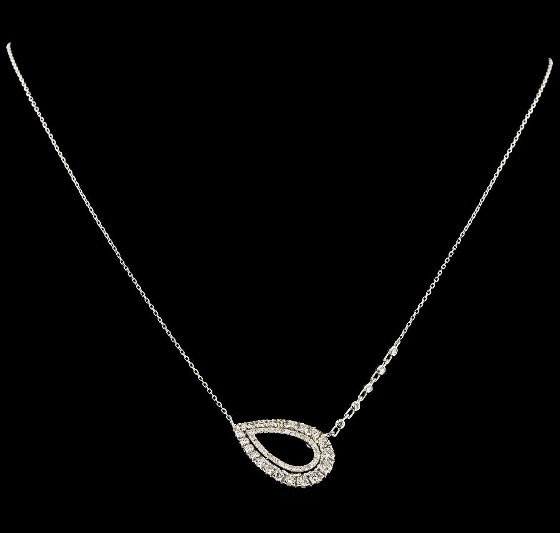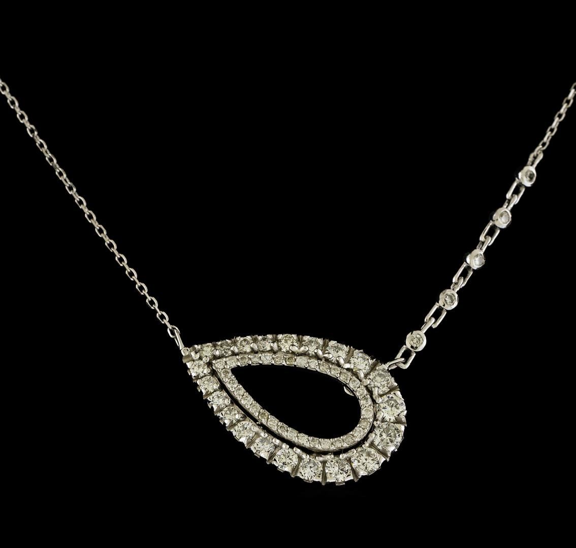 One electronically tested 14KT white gold lady's combination cast & assembled fashion necklace with a spring ring clasp with a bright polish finish. The featured lady's necklace has a horizontal pear shaped motif and a 1mm adjustable diamond cut cable link chain that can be worn between 16 and 18 inches in length. Identified with markings of '585'. Condition is new, good workmanship. Containing: Three prong set round brilliant cut diamonds, measuring 3.10 - 3.05 x 1.91mm (depth est.) approximate total weight of 3 Stones = 0.33ct. Graded in the setting. Clarity SI-1 to I-1. Color: H - I Cut Good Eighteen prong set round brilliant cut diamonds, measuring 2.20 - 2.15 x 1.35mm (depth est.) approximate total weight of 18 Stones = 0.70ct. Graded in the setting. Clarity SI-1 to SI-2. Color: G - I Cut Good Five bezel set round brilliant cut diamonds, measuring 1.60 - 1.50 x 0.96mm (depth est.) approximate total weight of 5 Stones = 0.07ct. Graded in the setting. Clarity SI-1 to I-1. Color: H - I Cut Good Thirty-Two prong set round brilliant cut diamonds, measuring 1.20 - 1.10 x 0.71mm (depth est.) approximate total weight of 32 Stones = 0.18ct. Graded in the setting. Clarity SI-1 to I-1. Color: H - I Cut Good. Total Weight of Diamonds 1.28ct.. Total Weight of Necklace 4.30gm. GAS Appraised at $3,745.00.