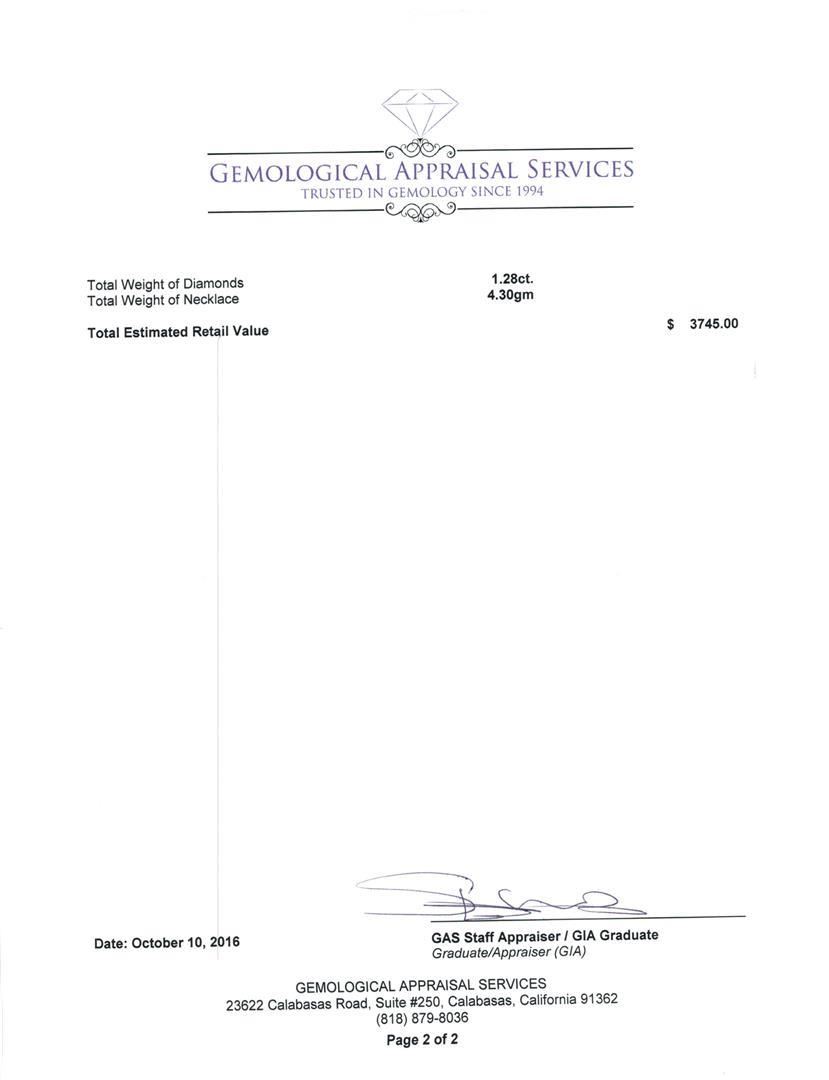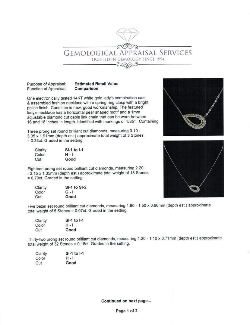 One electronically tested 14KT white gold lady's combination cast & assembled fashion necklace with a spring ring clasp with a bright polish finish. The featured lady's necklace has a horizontal pear shaped motif and a 1mm adjustable diamond cut cable link chain that can be worn between 16 and 18 inches in length. Identified with markings of '585'. Condition is new, good workmanship. Containing: Three prong set round brilliant cut diamonds, measuring 3.10 - 3.05 x 1.91mm (depth est.) approximate total weight of 3 Stones = 0.33ct. Graded in the setting. Clarity SI-1 to I-1. Color: H - I Cut Good Eighteen prong set round brilliant cut diamonds, measuring 2.20 - 2.15 x 1.35mm (depth est.) approximate total weight of 18 Stones = 0.70 ct. Graded in the setting. Clarity SI-1 to SI-2. Color: G - I Cut Good Five bezel set round brilliant cut diamonds, measuring 1.60 - 1.50 x 0.96mm (depth est.) approximate total weight of 5 Stones = 0.07ct. Graded in the setting. Clarity SI-1 to I-1. Color: H - I Cut Good Thirty-Two prong set round brilliant cut diamonds, measuring 1.20 - 1.10 x 0.71mm (depth est.) approximate total weight of 32 Stones = 0.18ct. Graded in the setting. Clarity SI-1 to I-1. Color: H - I Cut Good. Total Weight of Diamonds 1.28ct.. Total Weight of Necklace 4.30gm. GAS Appraised.