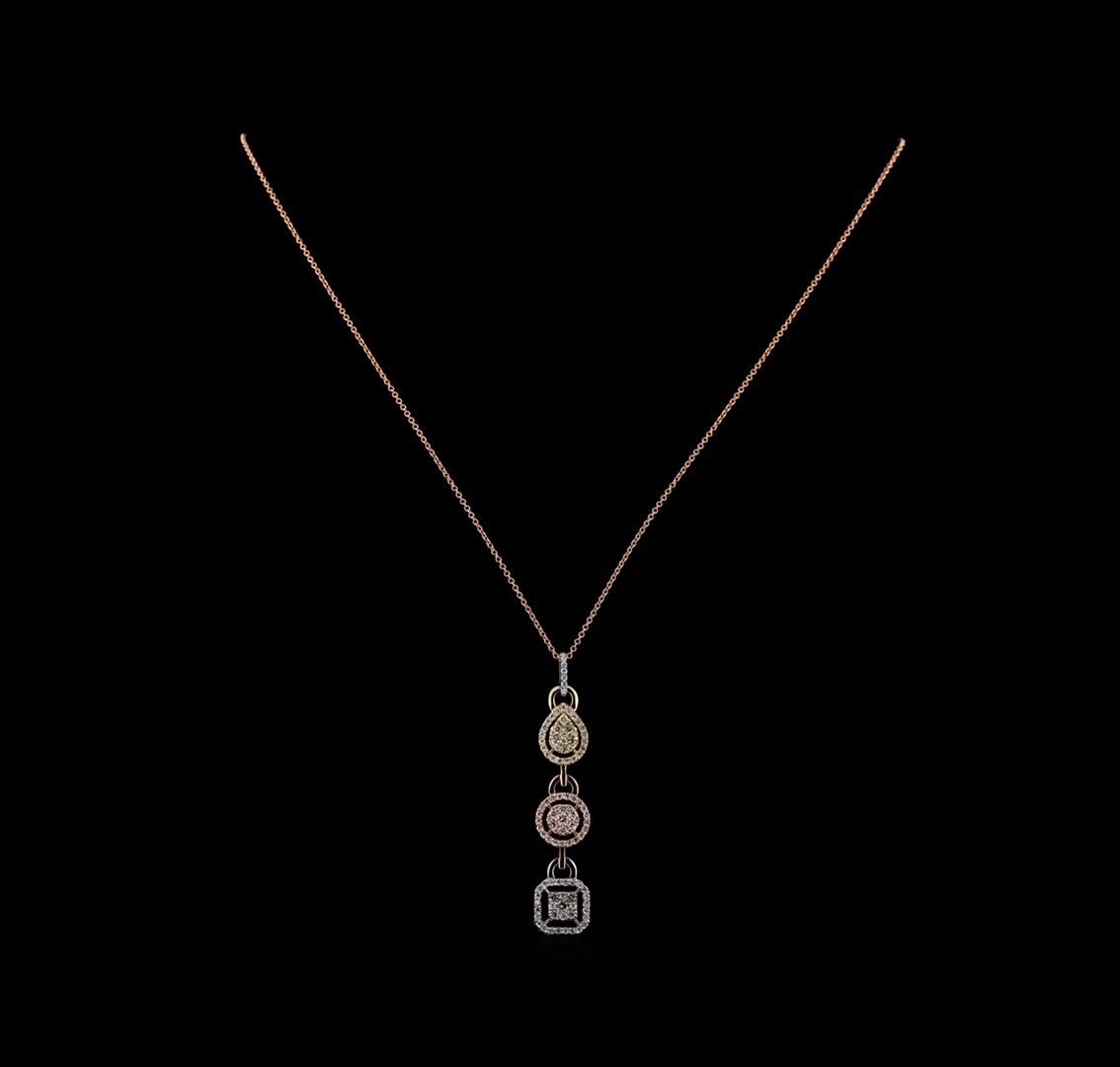 One electronically tested 14KT yellow, white, and rose gold lady's combination cast & assembled fashion pendant & chain 18.0" long, 1.25 round cable link with a lobster claw clasp with a bright polish finish. The featured lady's necklace has a 56 millimeter drop in length. Identified with markings of "K14". Condition is new, good workmanship. Containing: Four prong set round brilliant cut diamonds, measuring 2.60 - 2.30 x 1.52mm (depth est.) approximate total weight of 4 Stones = 0.26ct. Graded in the setting. Clarity: SI-1 to SI-2. Color: H - I. Cut Good Fourteen prong set round brilliant cut diamonds, measuring 1.90 - 1.80 x 1.15mm (depth est.) approximate total weight of 14 Stones = 0.34ct. Graded in the setting. Clarity: SI-1 to SI-2. Color: H - I. Cut Very Good Eighty-Eight prong set round brilliant cut diamonds, measuring 1.30 - 1.20 x 0.78mm (depth est.) approximate total weight of 88 Stones = 0.68ct. Graded in the setting. Clarity: SI-1 to SI-2. Color: G - I. Cut Good. Total Weight of Diamonds 1.28ct. Total Weight of Pendant & Chain 6.40gm. GAS Appraised.