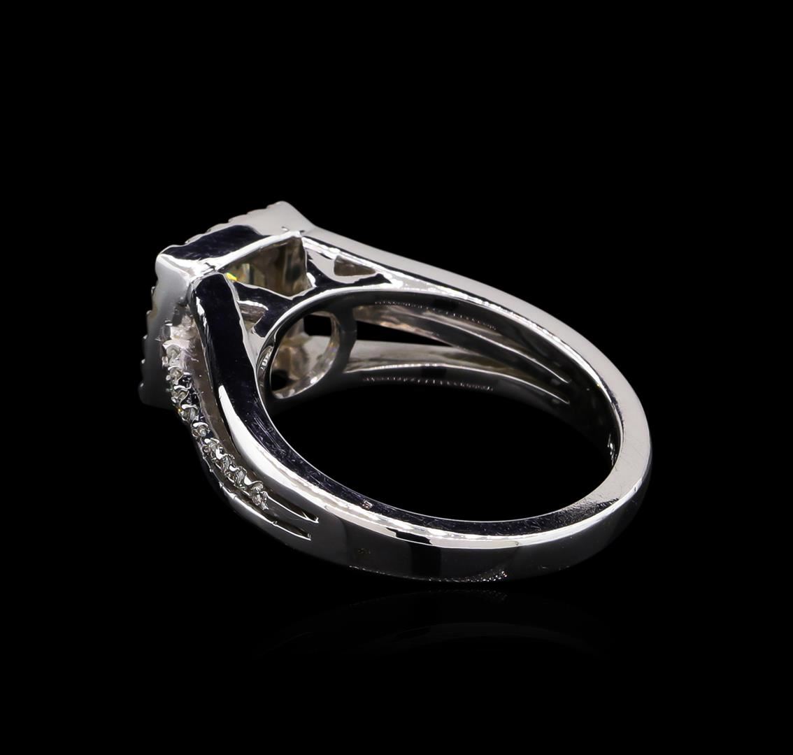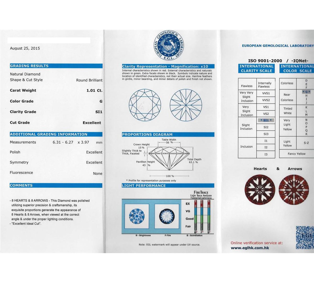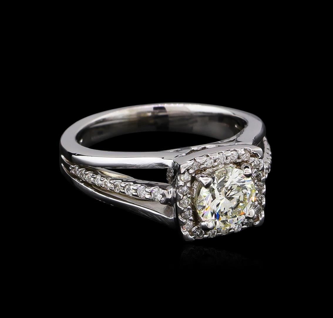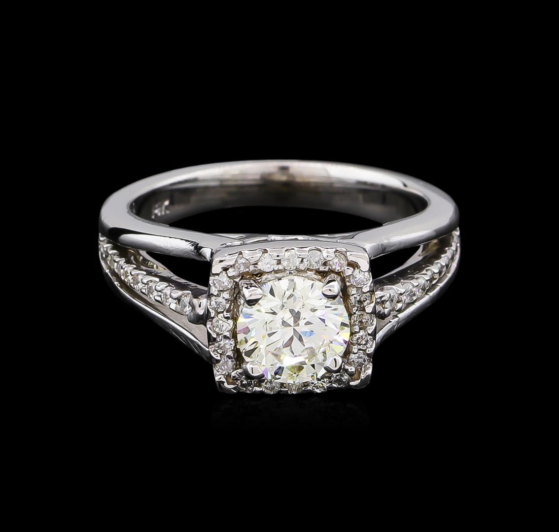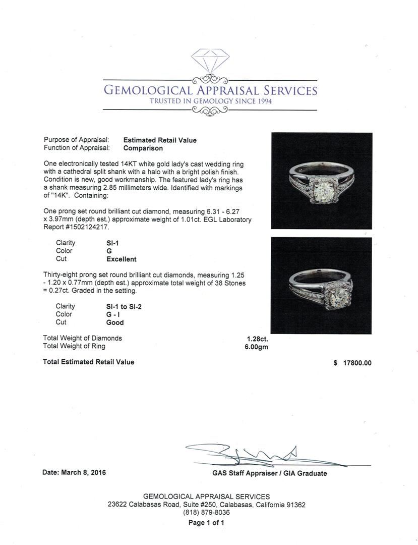 One electronically tested 14KT white gold lady's cast wedding ring with a cathedral split shank with a halo with a bright polish finish. The featured lady's ring has a shank measuring 2.85 millimeters wide. Identified with markings of "14K". Condition is new, good workmanship. Containing: One prong set round brilliant cut diamond, measuring 6.31 - 6.27 x 3.97mm (depth est.) approximate weight of 1.01ct. EGL Laboratory Report #1502124217. Clarity: SI-1. Color: G. Cut Excellent Thirty-Eight prong set round brilliant cut diamonds, measuring 1.25 - 1.20 x 0.77mm (depth est.) approximate total weight of 38 Stones = 0.27ct. Graded in the setting. Clarity: SI-1 to SI-2. Color: G - I. Cut Good. Total Weight of Diamonds 1.28ct. Total Weight of Ring 6.00gm. GAS Appraised at $17,800.00.