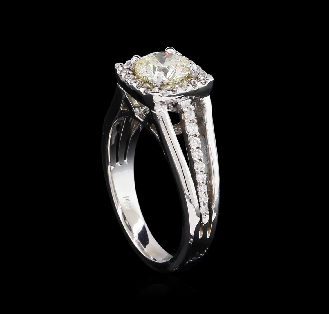 One electronically tested 14KT white gold lady's cast wedding ring with a cathedral split shank with a halo with a bright polish finish. The featured lady's ring has a shank measuring 2.85 millimeters wide. Identified with markings of "14K". Condition is new, good workmanship. Containing: One prong set round brilliant cut diamond, measuring 6.31 - 6.27 x 3.97mm (depth est.) approximate weight of 1.01ct. EGL Laboratory Report #1502124217. Clarity: SI-1. Color: G. Cut Excellent Thirty-Eight prong set round brilliant cut diamonds, measuring 1.25 - 1.20 x 0.77mm (depth est.) approximate total weight of 38 Stones = 0.27ct. Graded in the setting. Clarity: SI-1 to SI-2. Color: G - I. Cut Good. Total Weight of Diamonds 1.28ct. Total Weight of Ring 6.00gm. GAS Appraised at $17,800.00.