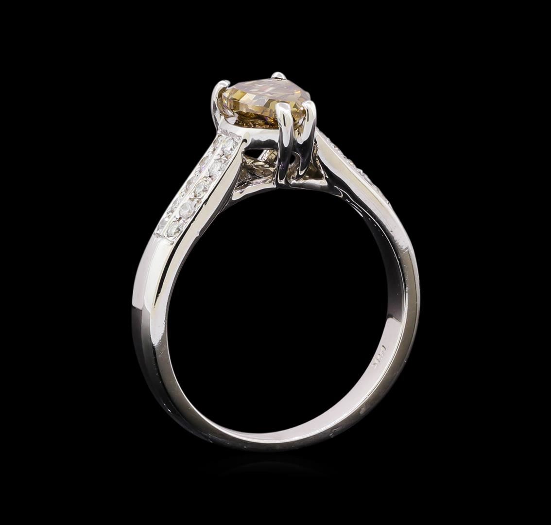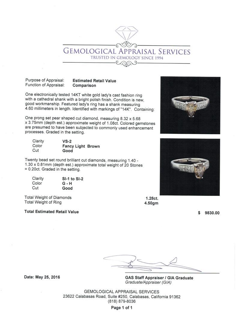 One electronically tested 14KT white gold lady's cast fashion ring with a cathedral shank with a bright polish finish. Featured lady's ring has a shank measuring 4.60 millimeters in width. Identified with markings of "14K". Condition is new, good workmanship. Containing: One prong set pear shaped cut diamond, measuring 8.32 x 5.68 x 3.75mm (depth est.) approximate weight of 1.08ct. Colored gemstones are presumed to have been subjected to commonly used enhancement processes. Graded in the setting. Clarity: VS-2 Cut Good Twenty bead set round brilliant cut diamonds, measuring 1.40 - 1.30 x 0.81mm (depth est.) approximate total weight of 20 Stones = 0.20 ct. Graded in the setting. Clarity: SI-1 to SI-2. Color: G - Good. Total Weight of Diamonds 1.28ct. Total Weight of Ring 4.50gm. GAS Appraised.