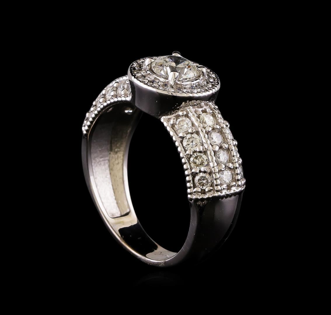 One electronically tested 14KT white gold lady's cast wedding ring with a halo with a bright polish with milgrain detailing finish. The featured lady's ring has a shank measuring 3.60 millimeters wide. Identified with markings of '14K'. Condition is new, good workmanship. Containing: One prong set round brilliant cut diamond, measuring 4.97 - 4.90 x 3.24mm (depth est.) , 5.00.%. GTCF approximate weight of 0.52ct. Graded in the setting. Clarity SI-2. Color: G Cut Good Twenty-Four prong set round brilliant cut diamonds, measuring 1.90 - 1.85 x 1.17mm (depth est.) approximate total weight of 24 Stones = 0.60 ct. Graded in the setting. Clarity SI-1 to I-1. Color: G - H Cut Good Sixteen prong set round brilliant cut diamonds, measuring 1.40 - 1.35 x 0.86mm (depth est.) approximate total weight of 16 Stones = 0.16ct. Graded in the setting. Clarity SI-1 to I-1. Color: G - H Cut Good. Total Weight of Diamonds 1.28ct.. Total Weight of Ring 4.60gm. GAS Appraised.