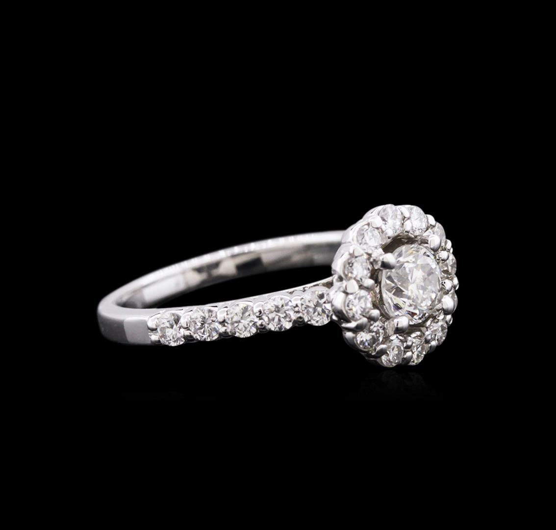 One electronically tested 14KT white gold ladies cast diamond engagement ring with a bright polish finish. Identified with markings of "14K". Condition is new. Containing: One prong set round brilliant cut diamond, measuring 4.80 - 4.80 x 2.88mm (depth est.) approximate weight of 0.53ct. Clarity: I-1. Color: J, Cut is Good. Twenty-Two prong set round brilliant cut diamonds, measuring 2.00 - 2.00 x 1.20mm (depth est.) approximate total weight of 22 Stones = 0.75ct. Clarity: I-1 to I-2. Color: I - J, Cut is Good. Diamonds are graded in the mounting, unless otherwise stated. Total Weight of Diamonds 1.28ct. Total Weight of Engagement Ring 4.10 grams.