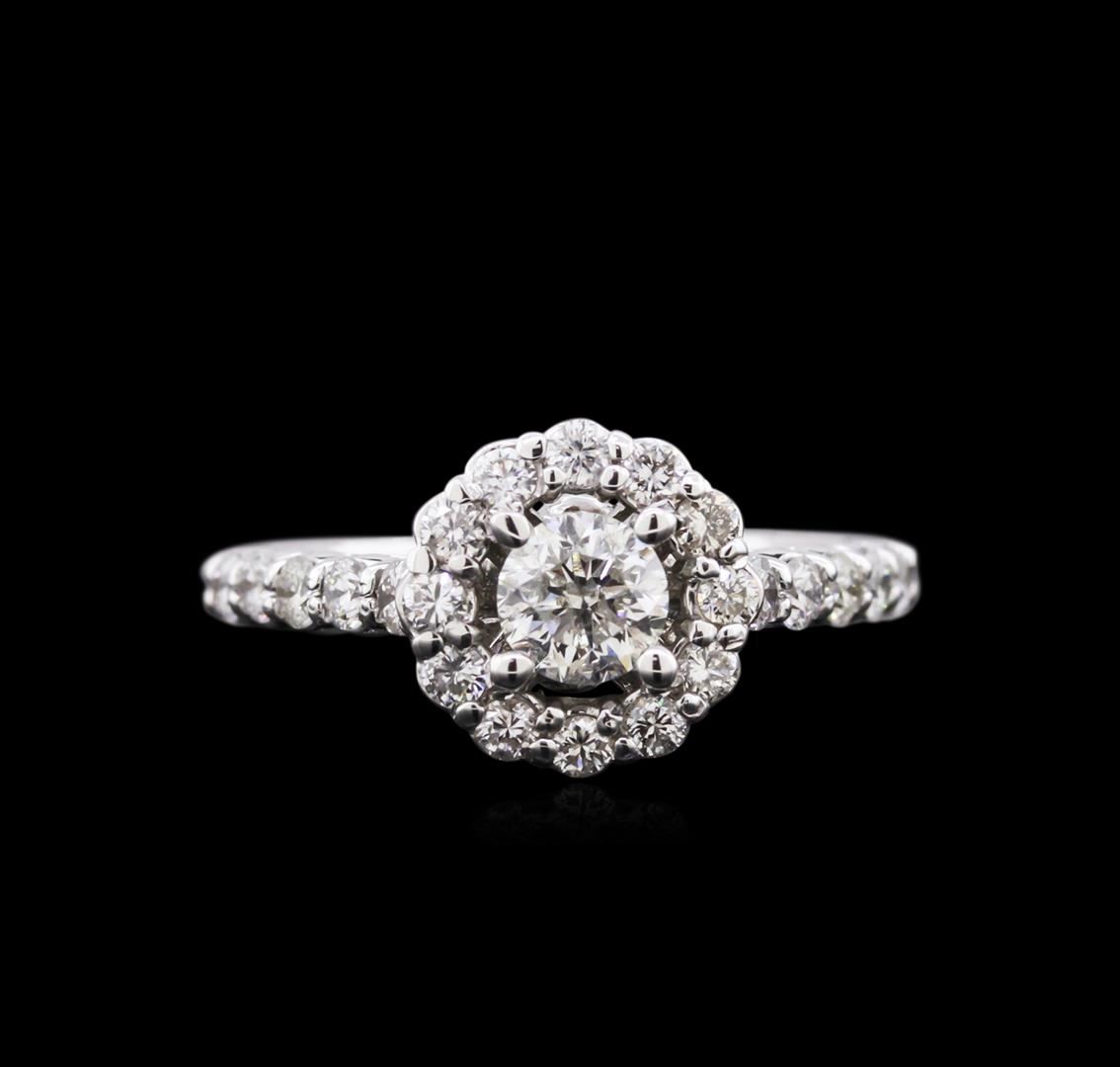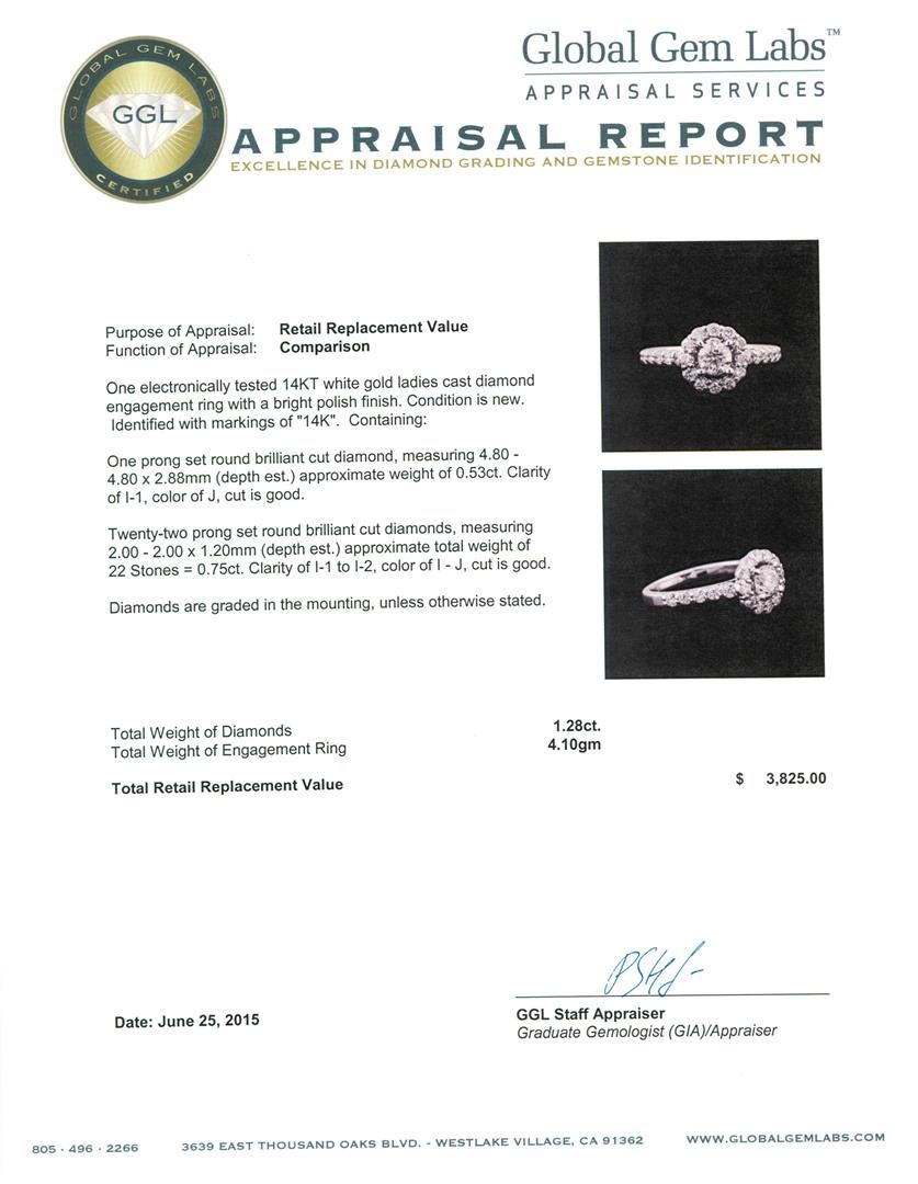 One electronically tested 14KT white gold ladies cast diamond engagement ring with a bright polish finish. Identified with markings of "14K". Condition is new. Containing: One prong set round brilliant cut diamond, measuring 4.80 - 4.80 x 2.88mm (depth est.) approximate weight of 0.53ct. Clarity: I-1. Color: J, Cut is Good. Twenty-Two prong set round brilliant cut diamonds, measuring 2.00 - 2.00 x 1.20mm (depth est.) approximate total weight of 22 Stones = 0.75ct. Clarity: I-1 to I-2. Color: I - J, Cut is Good. Diamonds are graded in the mounting, unless otherwise stated. Total Weight of Diamonds 1.28ct. Total Weight of Engagement Ring 4.10 grams.