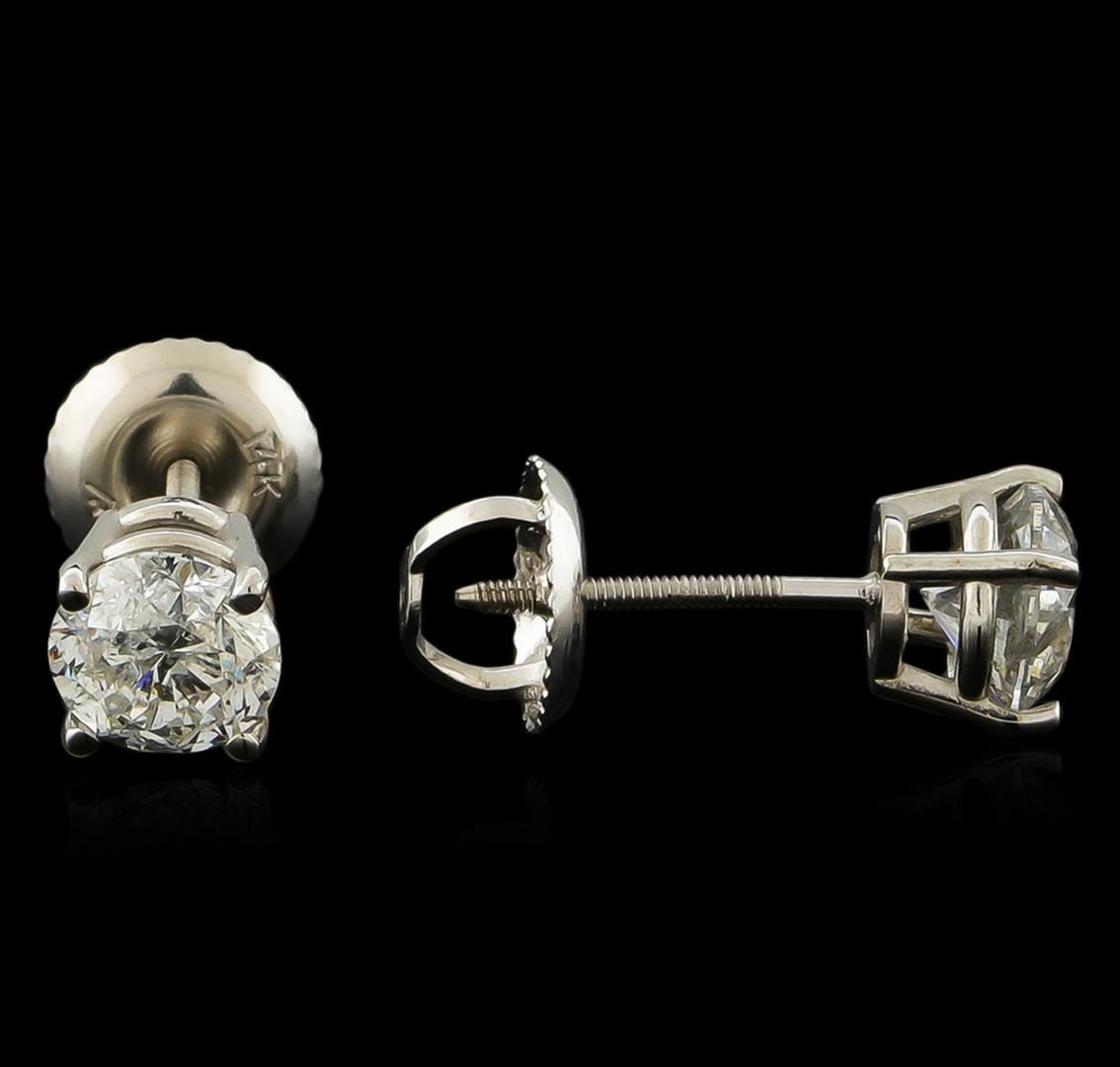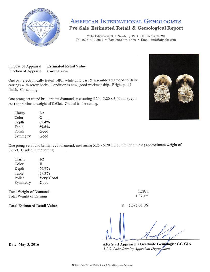 One pair electronically tested 14KT white gold cast & assembled diamond solitaire earrings with screw backs. Bright polish finish. Condition is new, good workmanship. Containing: One prong set round brilliant cut diamond, measuring 5.20 - 5.20 x 3.40mm (depth est.) approximate weight of 0.63ct. Graded in the setting. Clarity: I-2. Color: 65.4%. Table 59.6%. One prong set round brilliant cut diamond, measuring 5.25 - 5.20 x 3.50mm (depth est.) approximate weight of 0.65ct. Graded in the setting. Clarity: I-2. Color: 66.9%. Table 59.3%. Total Weight of Diamonds 1.28ct. Total Weight of Earrings 1.07gm. AIG Appraised at $5,095.00.
