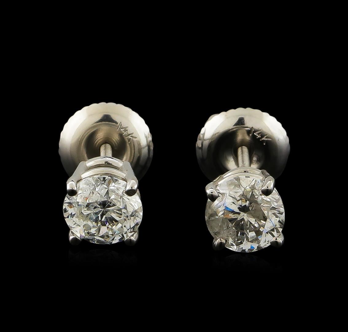One pair electronically tested 14KT white gold cast & assembled diamond solitaire earrings with screw backs. Bright polish finish. Condition is new, good workmanship. Containing: One prong set round brilliant cut diamond, measuring 5.20 - 5.20 x 3.40mm (depth est.) approximate weight of 0.63ct. Graded in the setting. Clarity: I-2. Color: 65.4%. Table 59.6%. One prong set round brilliant cut diamond, measuring 5.25 - 5.20 x 3.50mm (depth est.) approximate weight of 0.65ct. Graded in the setting. Clarity: I-2. Color: 66.9%. Table 59.3%. Total Weight of Diamonds 1.28ct. Total Weight of Earrings 1.07gm. AIG Appraised at $5,095.00.