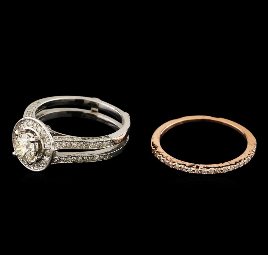 One set electronically tested 14KT rose and white gold lady's cast wedding ring & wedding band with a bright polish with milgrain detailing finish. The featured lady's wedding set has a triple shank measuring 4.24 millimeters wide. Identified with markings of "K14". Condition is new, good workmanship. Containing: One prong set round brilliant cut diamond, measuring 5.09 - 5.08 x 3.33mm (depth est.) approximate weight of 0.55ct. Graded in the setting. Clarity: SI-2. Color: I - Very Good One Hundred Thirty-Three prong set round brilliant cut diamonds, measuring 1.20 - 1.10 x 0.69mm (depth est.) approximate total weight of 133 Stones = 0.73ct. Graded in the setting. Clarity: SI-2 to I-1. Color: H - I. Cut Good. Total Weight of Diamonds 1.28ct. Total Weight of Ring & Wedding Band 5.50gm. GAS Appraised at $7,000.00.