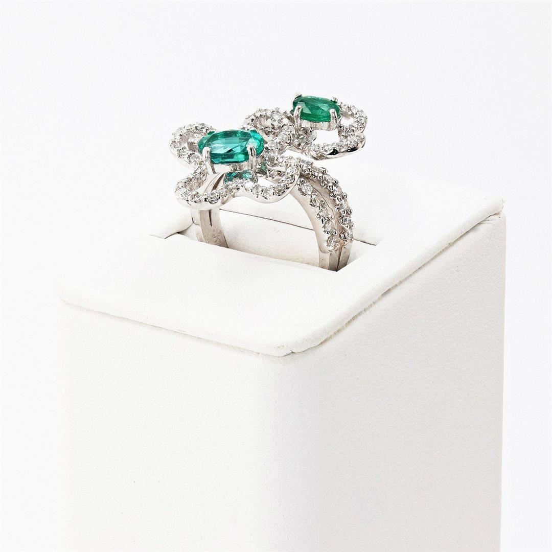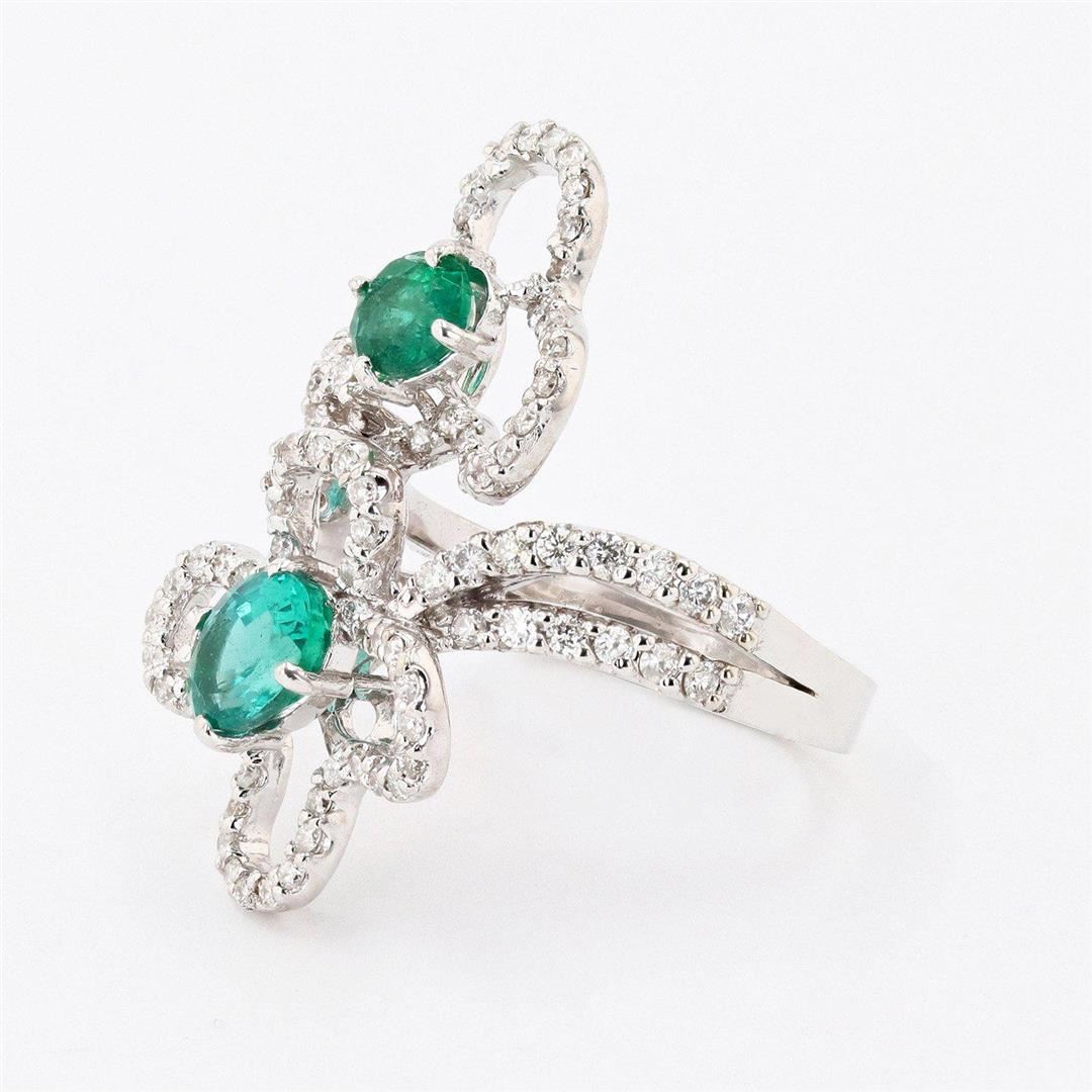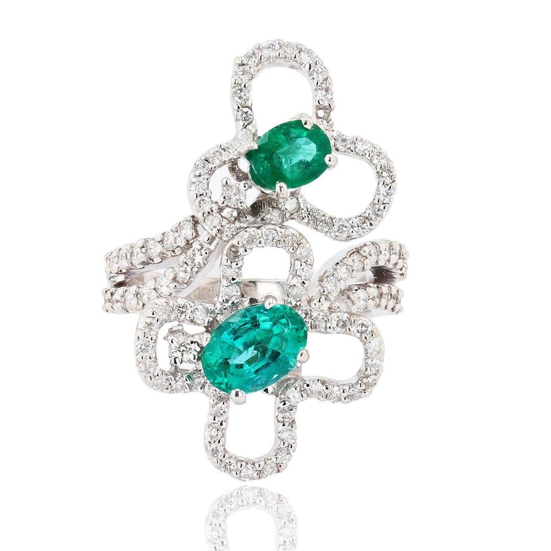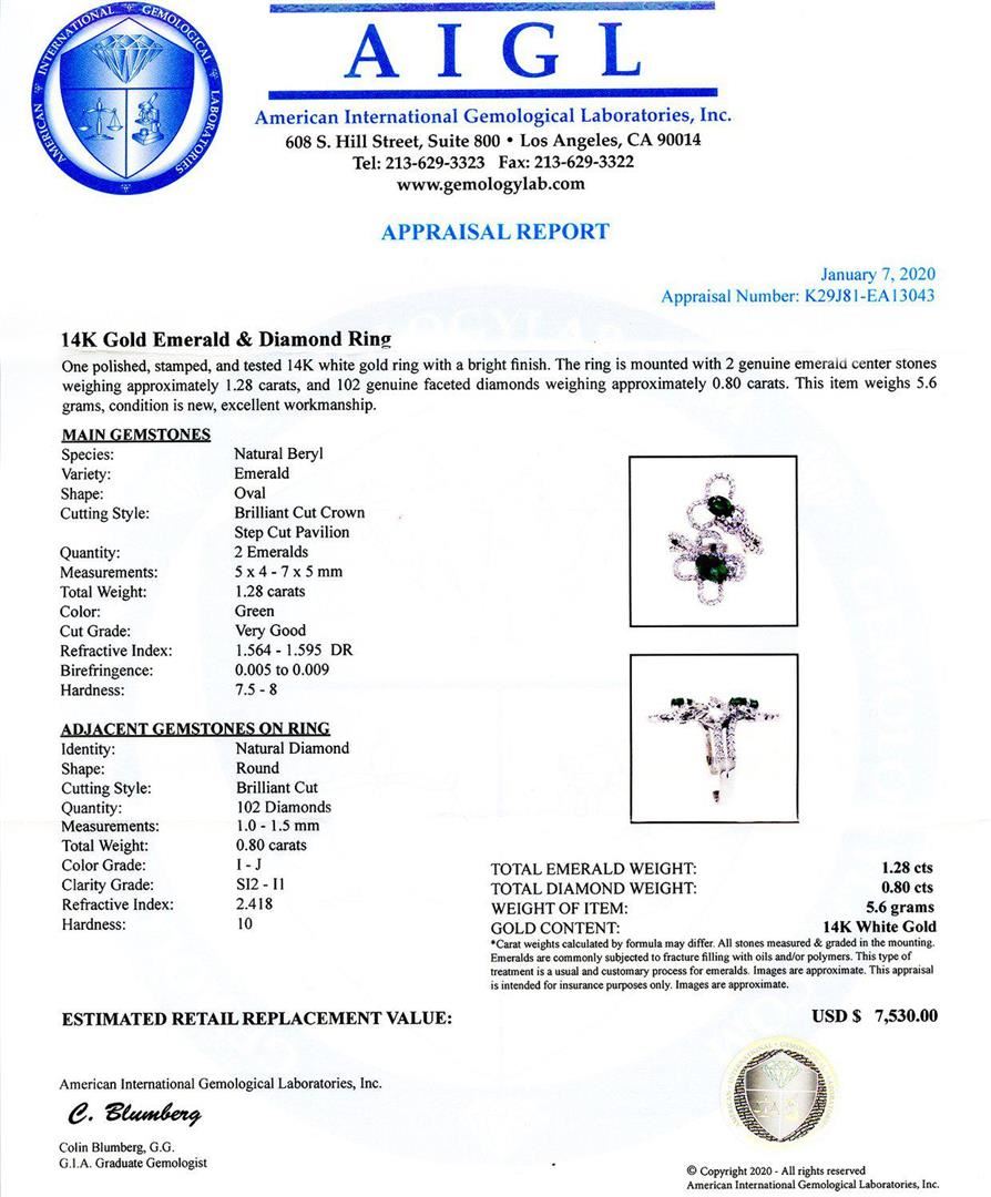 One polished, stamped, and tested 14K white gold ring with a bright finish. The ring is mounted with 2 genuine emerald center stones weighing approximately 1.28 carats, and 102 genuine faceted diamonds weighing approximately 0.80 carats. This item weighs