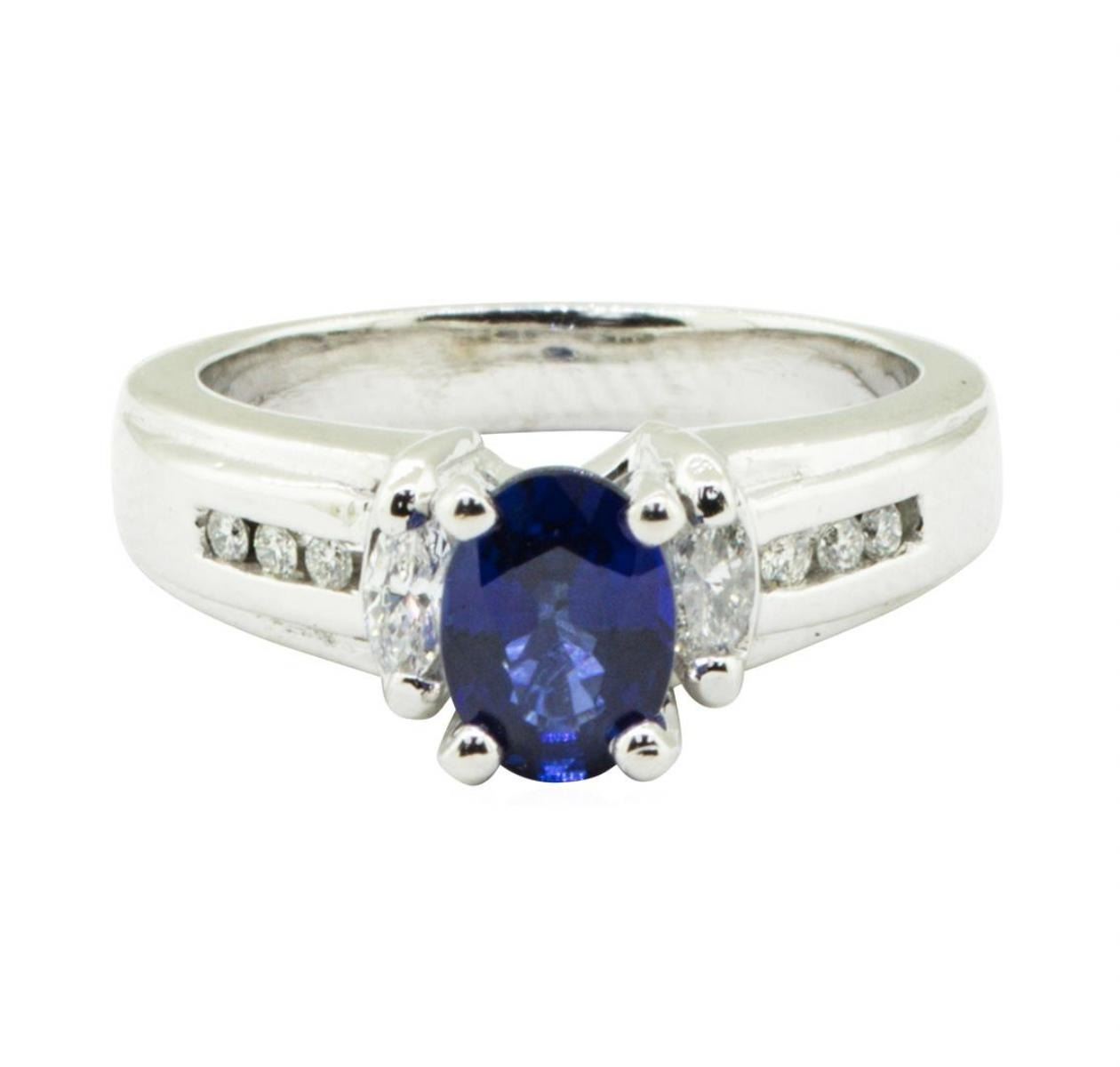 One electronically tested platinum lady's combination cast & assembled fashion straight line ring with a cathedral shank with a bright polish finish. The featured lady's ring has a shank measuring 3.00 millimeters in width. Identified with markings of 'PT 950'. Condition is like new, good workmanship. Containing: One prong set oval modified brilliant cut natural blue sapphire, measuring 7.08 x 5.10 x 3.20mm, (depth est.) 3%. bulge factor, approximate weight of 1.03ct., clarity is eye clean, medium dark, moderately strong, blue color, (GIA B 6/4), cut is very good. Transmitting light with no distortion, transparent. Colored gemstones are presumed to have been subjected to commonly used enhancement processes. Graded in the setting. Two prong set marquise shaped cut diamonds, measuring 4.15 x 2.10 x 1.32mm (depth est.) approximate total weight of 2 Stones = 0.15ct. Graded in the setting. Color H - I Clarity VS-2 to SI-1 Cut Very Good Six channel set round brilliant cut diamonds, measuring 1.60 - 1.55 x 0.95mm (depth est.) approximate total weight of 6 Stones = 0.10 ct. Graded in the setting. Color H - I Clarity VS-2 to SI-1 Cut Very Good. Total Weight of Colored Stones 1.03ct.. Total Weight of Diamonds 0.25ct.. Total Weight of Ring 10.30gm GAS Appraised at $4050.00. GAS Appraised.
