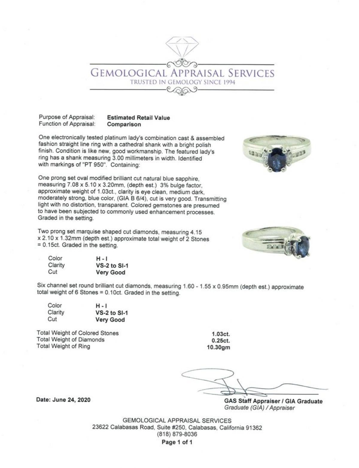 One electronically tested platinum lady's combination cast & assembled fashion straight line ring with a cathedral shank with a bright polish finish. The featured lady's ring has a shank measuring 3.00 millimeters in width. Identified with markings of 'PT 950'. Condition is like new, good workmanship. Containing: One prong set oval modified brilliant cut natural blue sapphire, measuring 7.08 x 5.10 x 3.20mm, (depth est.) 3%. bulge factor, approximate weight of 1.03ct., clarity is eye clean, medium dark, moderately strong, blue color, (GIA B 6/4), cut is very good. Transmitting light with no distortion, transparent. Colored gemstones are presumed to have been subjected to commonly used enhancement processes. Graded in the setting. Two prong set marquise shaped cut diamonds, measuring 4.15 x 2.10 x 1.32mm (depth est.) approximate total weight of 2 Stones = 0.15ct. Graded in the setting. Color H - I Clarity VS-2 to SI-1 Cut Very Good Six channel set round brilliant cut diamonds, measuring 1.60 - 1.55 x 0.95mm (depth est.) approximate total weight of 6 Stones = 0.10 ct. Graded in the setting. Color H - I Clarity VS-2 to SI-1 Cut Very Good. Total Weight of Colored Stones 1.03ct.. Total Weight of Diamonds 0.25ct.. Total Weight of Ring 10.30gm GAS Appraised at $4050.00. GAS Appraised.