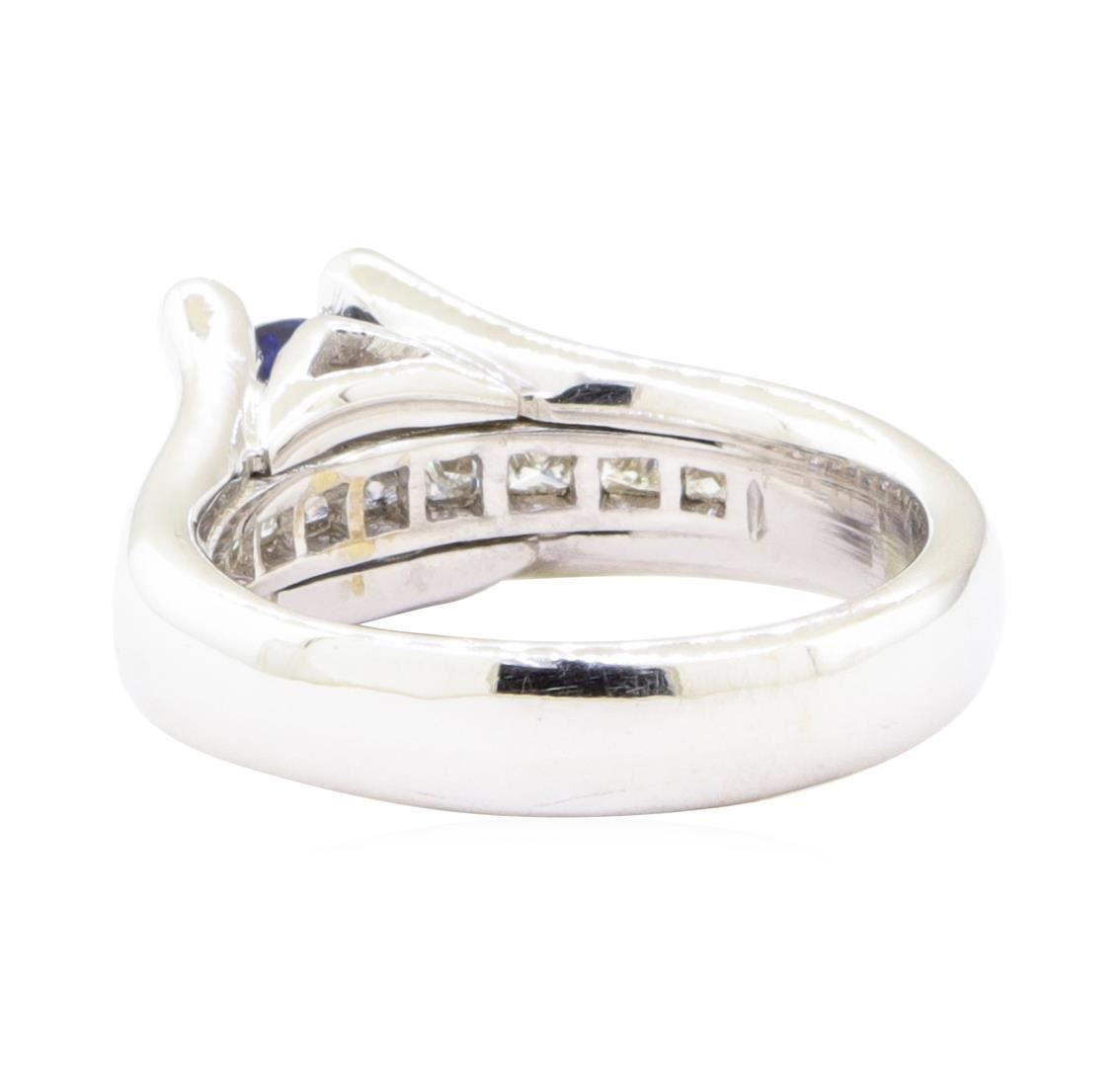 One electronically tested 14KT white gold lady's combination cast & assembled fashion ring with a straight line with a bright polish finish. The featured lady's ring has a shank measuring 4.00 millimeters. Condition is new, good workmanship. Containing: One prong set round modified brilliant cut natural blue sapphire, measuring 5.70 - 5.67 x 3.00 mm, (depth est.) approximate weight of 0.78ct., clarity is eye clean, medium, strong, blue color, (GIA B 5/5), cut is very good. Transmitting light with no distortion, transparent. Colored gemstones are presumed to have been subjected to commonly used enhancement processes. Graded in the setting. Ten invisible set princess cut diamonds, measuring 2.10 x 2.00 x 1.51mm (depth est.) approximate total weight of 10 Stones = 0.50 ct. Graded in the setting. Color G - H Clarity VS-1 to VS-2 Cut Very Good. Total Weight of Colored Stones 0.78ct.. Total Weight of Diamonds 0.50 ct.. Total Weight of Ring 7.60gm GAS Appraised at $3445.00. GAS Appraised.