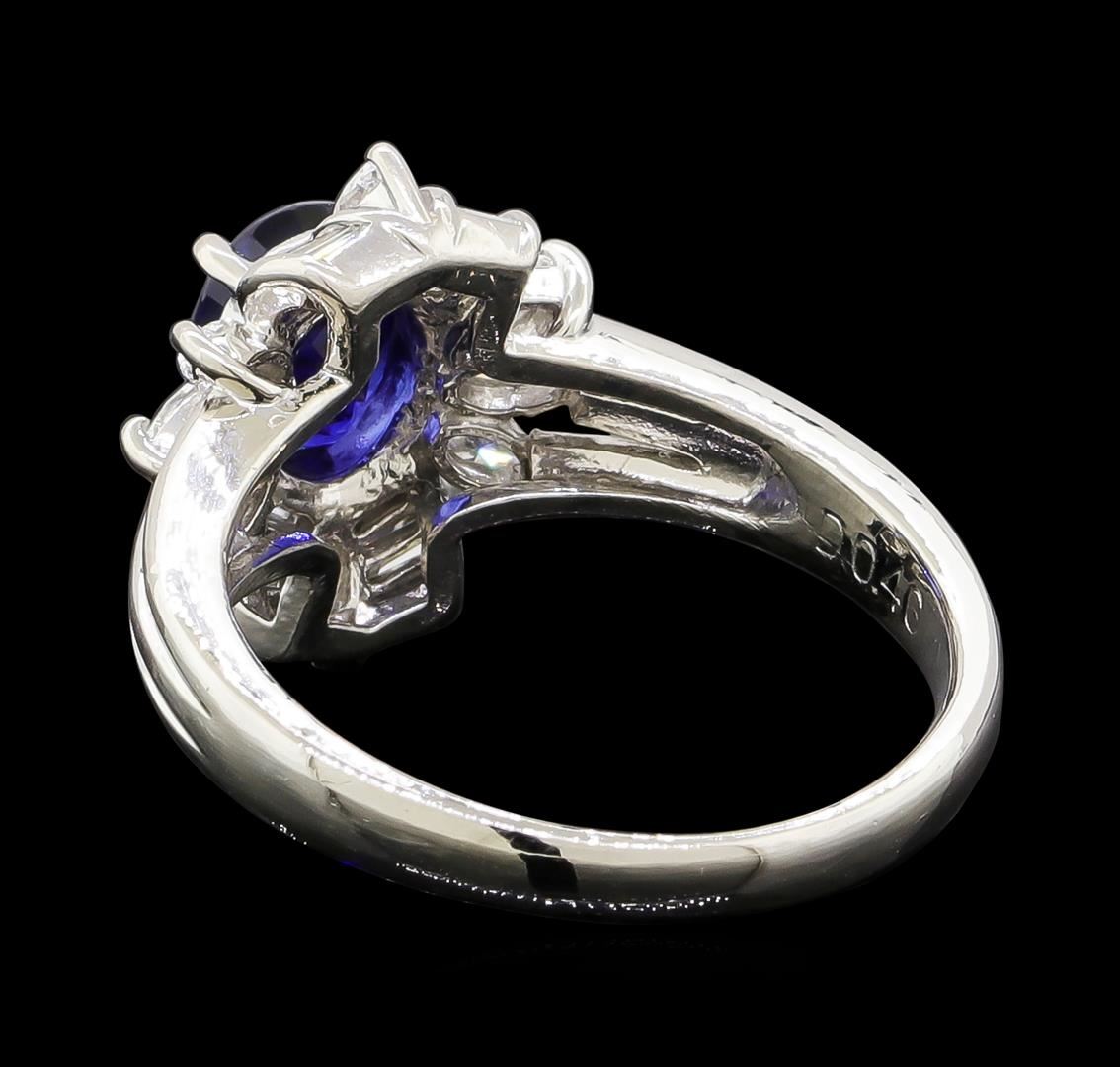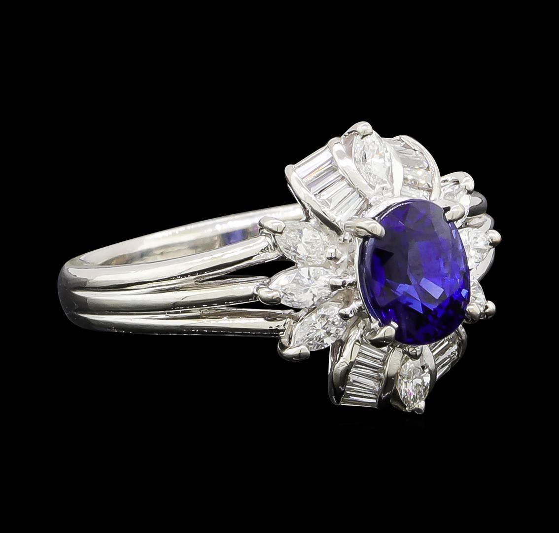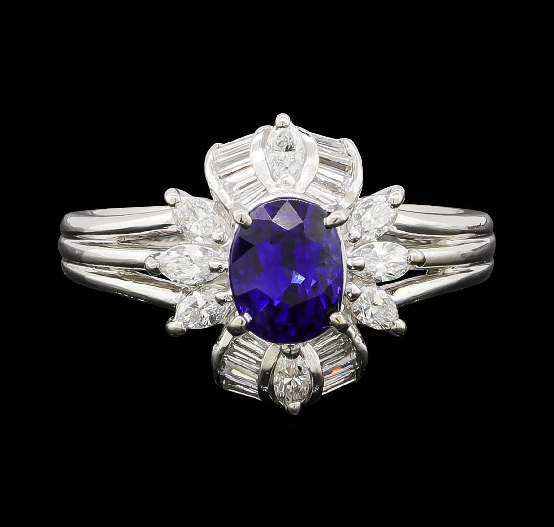 One ring featuring: Platinum containing Sapphire with a total weight of 1.28ct and Diamonds with a total weight of 0.46ct. Total Weight of Ring: 5.8 grams.