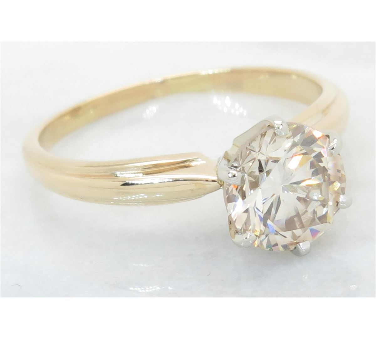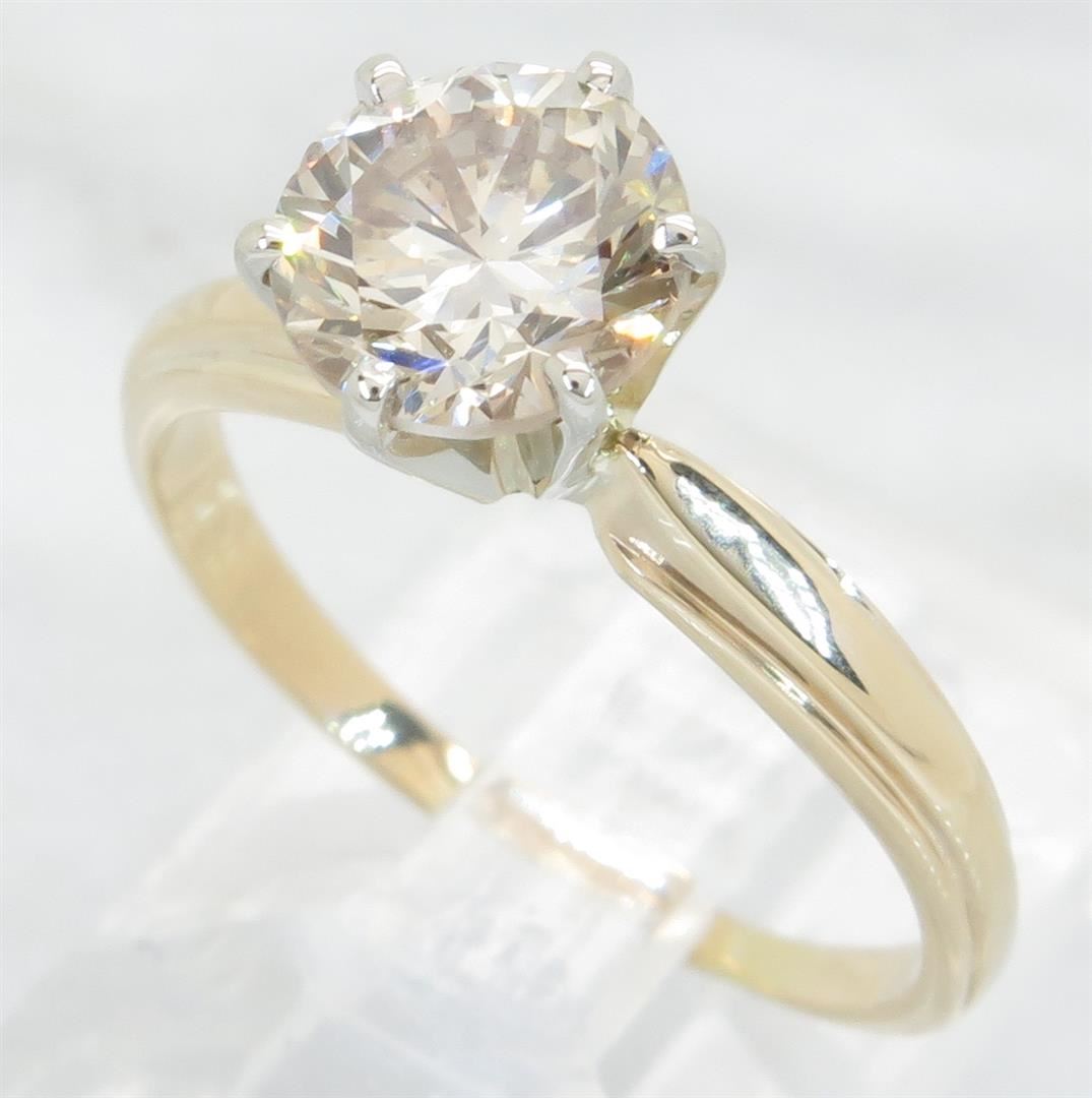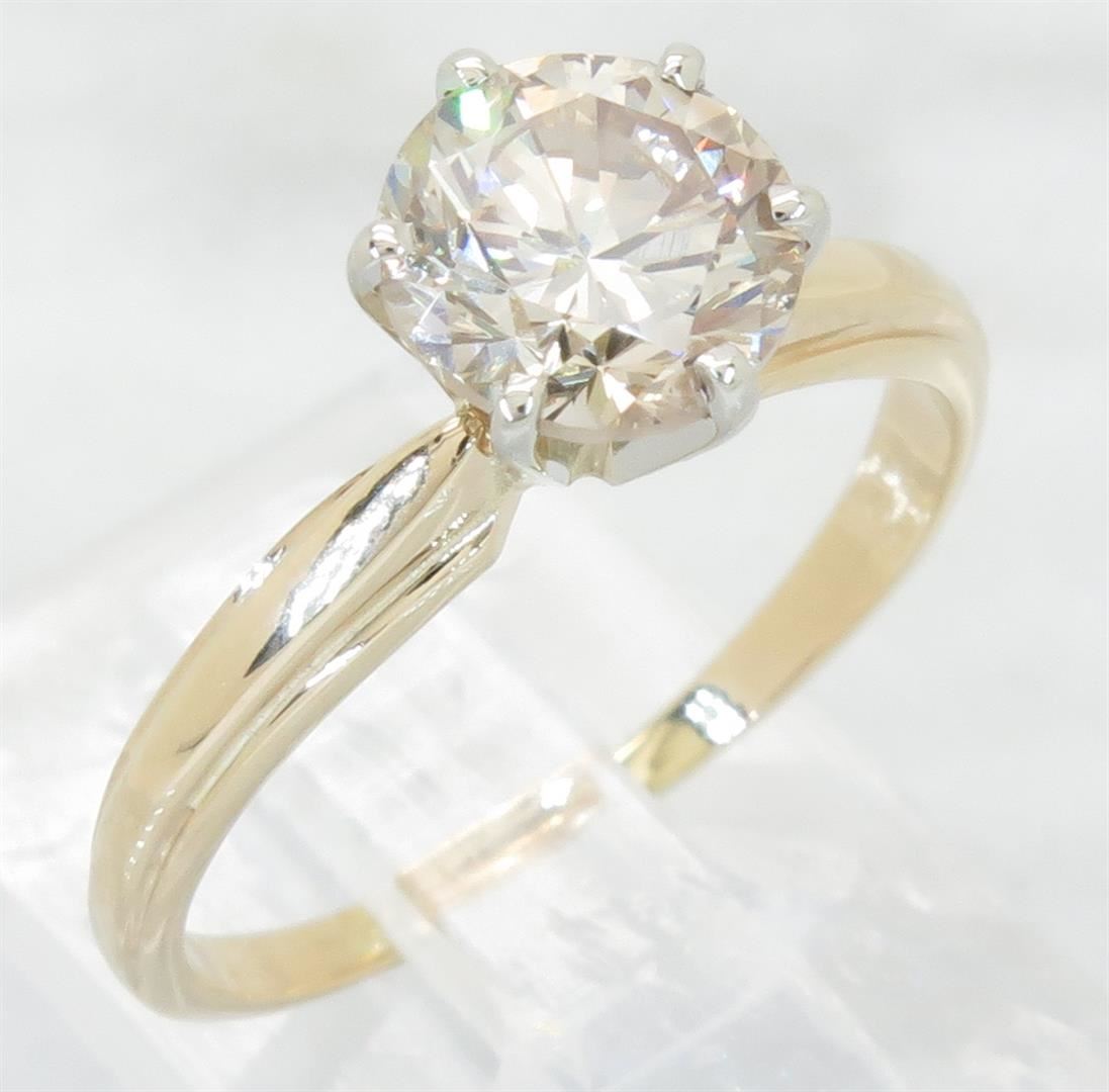 One tested 14K yellow gold diamond ring. Containing: One Round Brilliant Cut Diamond. Approximate Size: 1.28CT, Clarity: SI, Color: Light Chocolate. All diamonds are graded in the mounting unless otherwise stated. Weight of ring: 2.4 grams, Size: 5.5