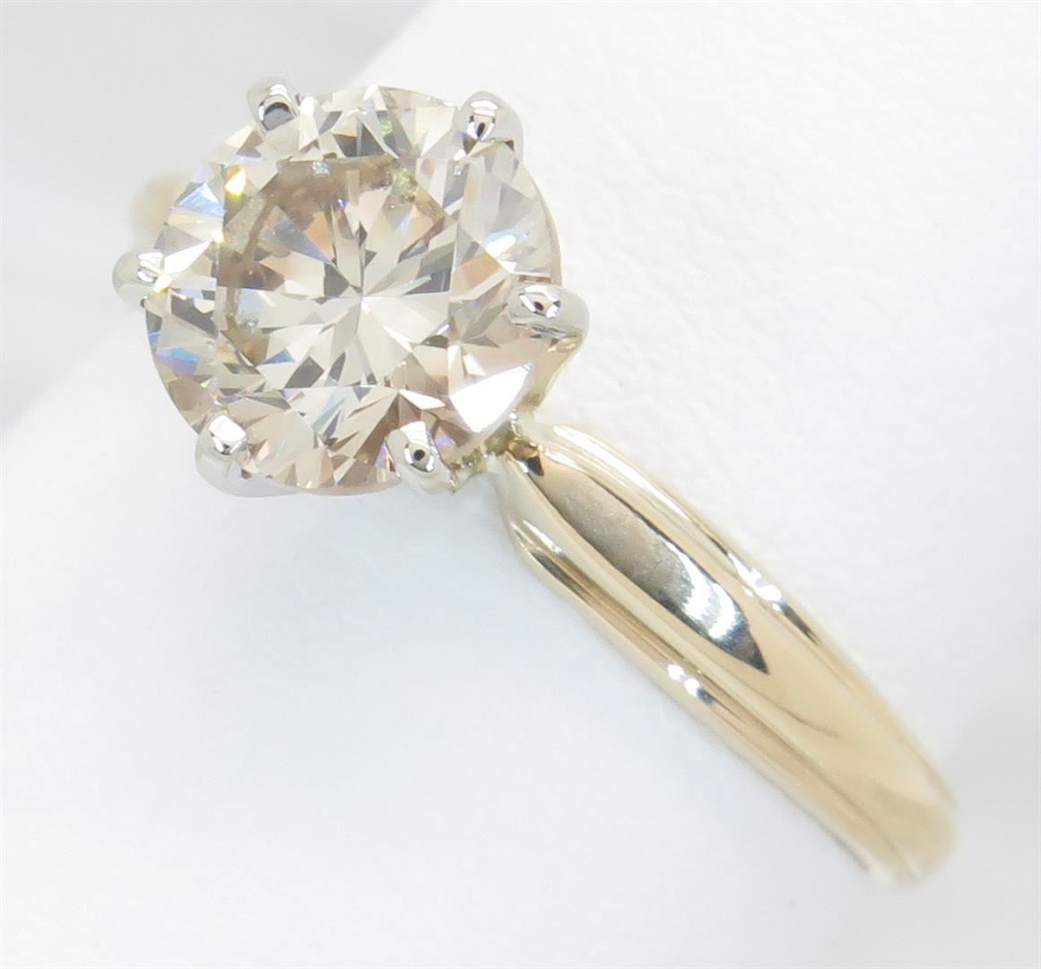 One tested 14K yellow gold diamond ring. Containing: One Round Brilliant Cut Diamond. Approximate Size: 1.28CT, Clarity: SI, Color: Light Chocolate. All diamonds are graded in the mounting unless otherwise stated. Weight of ring: 2.4 grams, Size: 5.5
