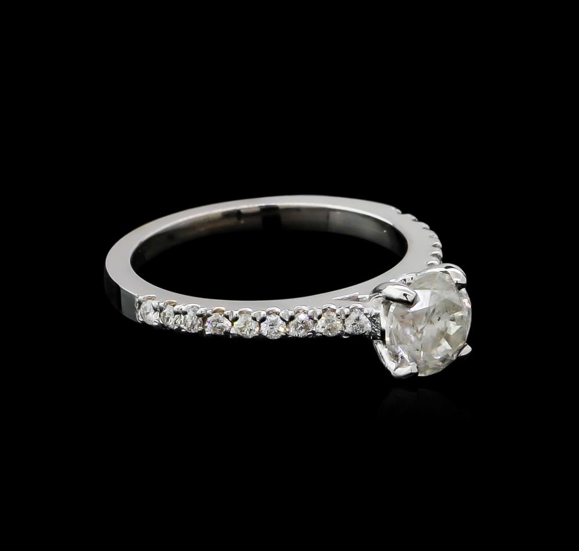 One electronically tested 14KT white gold ladies cast diamond unity ring with a bright polish finish. The featured diamond is supported by diamond ribbon shoulders, completed by a one millimeter wide band. Identified with markings of "14K". Condition is new, good workmanship. Containing: One prong set round brilliant cut diamond, measuring 6.10 - 6.05 x 4.10mm (depth est.), 5.00.%. GTCF approximate weight of 1.05ct with a medium blue fluorescence. Graded in the setting. Clarity: I-2. Color: I. Depth 67.4%. Table 59.2%. Eighteen prong set round brilliant cut diamonds approximate total weight of 18 Stones = 0.23ct. Graded in the setting. Clarity: SI-2 to I-2. Color: G - I. Total Weight of Diamonds 1.28ct. Total Weight of Ring 2.79gm. AIG Appraised at $8,770.00.