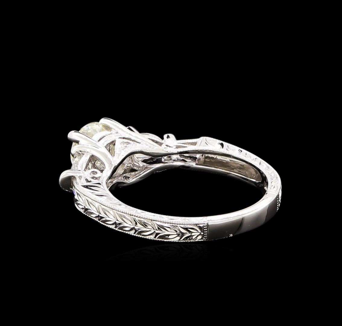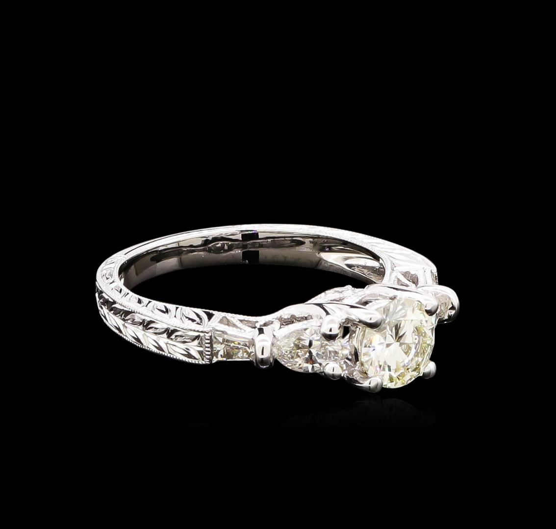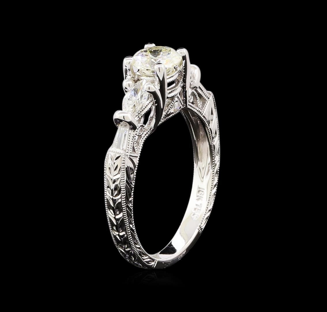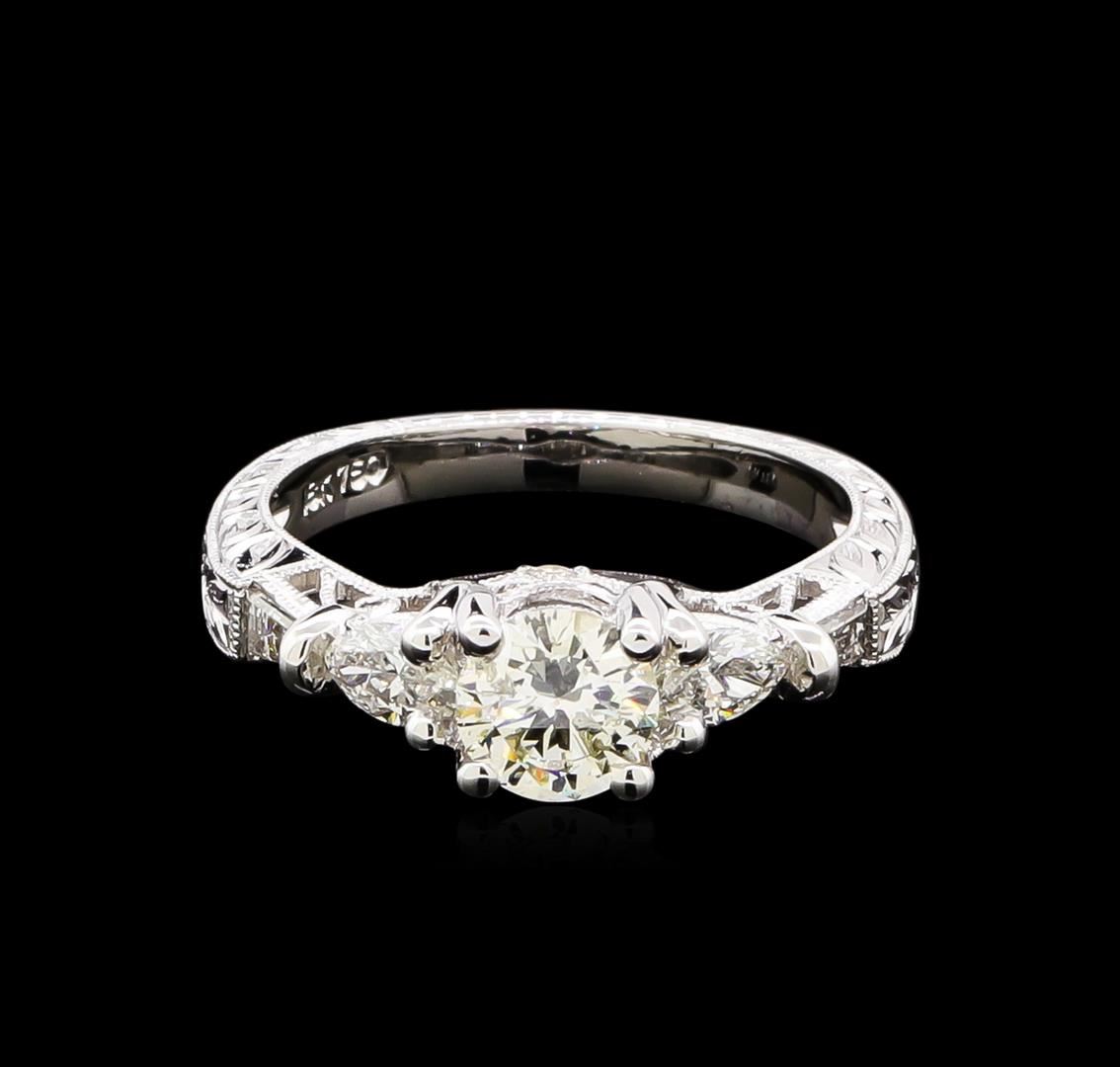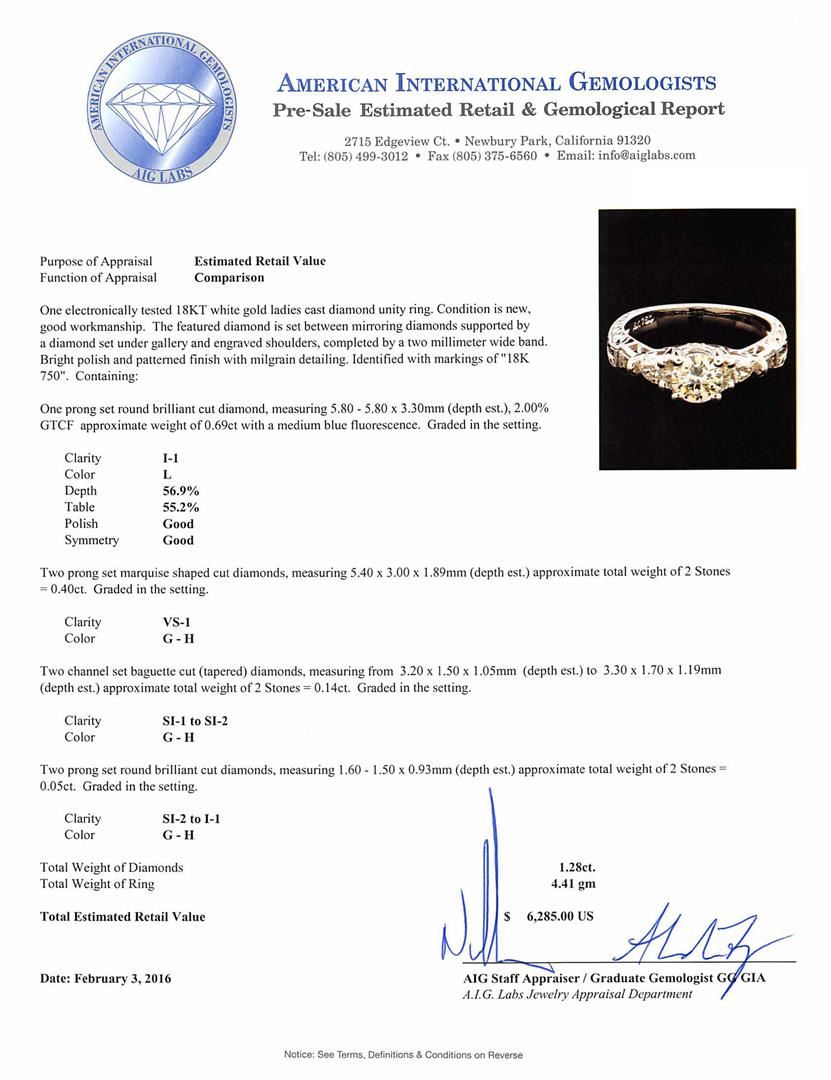 One electronically tested 18KT white gold ladies cast diamond unity ring. The featured diamond is set between mirroring diamonds supported by a diamond set under gallery and engraved shoulders, completed by a two millimeter wide band. Bright polish and patterned finish with milgrain detailing. Identified with markings of "18K 750". Condition is new, good workmanship. Containing: One prong set round brilliant cut diamond, measuring 5.80 - 5.80 x 3.30mm (depth est.), 2.00.%. GTCF approximate weight of 0.69ct with a medium blue fluorescence. Graded in the setting. Clarity: I-1. Color: L. Depth 56.9%. Table 55.2%. Two prong set marquise shaped cut diamonds, measuring 5.40 x 3.00 x 1.89mm (depth est.) approximate total weight of 2 Stones = 0.40ct. Graded in the setting. Clarity: VS-1. Color: G - H Two channel set baguette cut (tapered) diamonds, measuring from 3.20 x 1.50 x 1.05mm (depth est.) to 3.30 x 1.70 x 1.19mm (depth est.) approximate total weight of 2 Stones = 0.14ct. Graded in the setting. Clarity: SI-1 to SI-2. Color: G - H Two prong set round brilliant cut diamonds, measuring 1.60 - 1.50 x 0.93mm (depth est.) approximate total weight of 2 Stones = 0.05ct. Graded in the setting. Clarity: SI-2 to I-1. Color: G - H. Total Weight of Diamonds 1.28ct. Total Weight of Ring 4.41gm. AIG Appraised at $6,285.00.