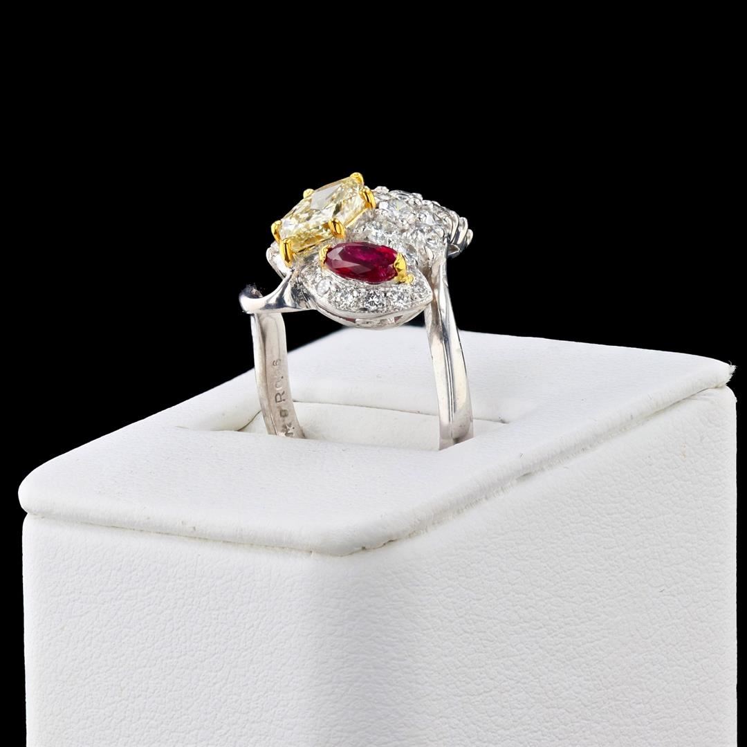 1.29ct CENTER Diamond (2.31ctw) and 0.36ct Ruby 18K White Gold Ring. Please see Photos and Description for all available information. This beautiful ring features a 1.29ct center diamond, set in a classic 18K white gold setting. This diamond is surrounded by an oval frame of smaller round diamonds. The center diamond is flanked by two ruby gemstones on each side. This ring is the perfect symbol of your commitment to love. The ring is size 6.