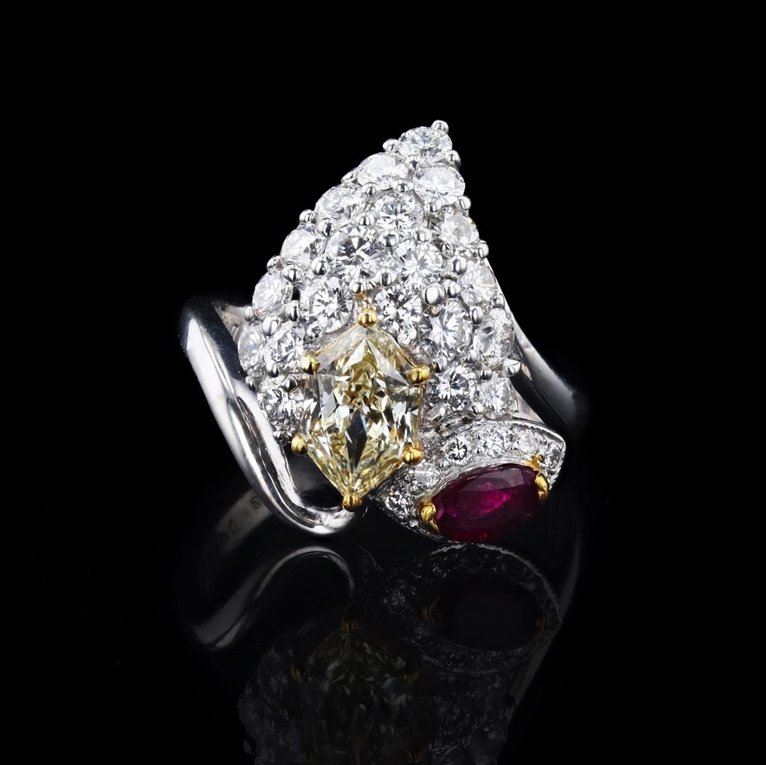 1.29ct CENTER Diamond (2.31ctw) and 0.36ct Ruby 18K White Gold Ring. Please see Photos and Description for all available information. This beautiful ring features a 1.29ct center diamond, set in a classic 18K white gold setting. This diamond is surrounded by an oval frame of smaller round diamonds. The center diamond is flanked by two ruby gemstones on each side. This ring is the perfect symbol of your commitment to love. The ring is size 6.
