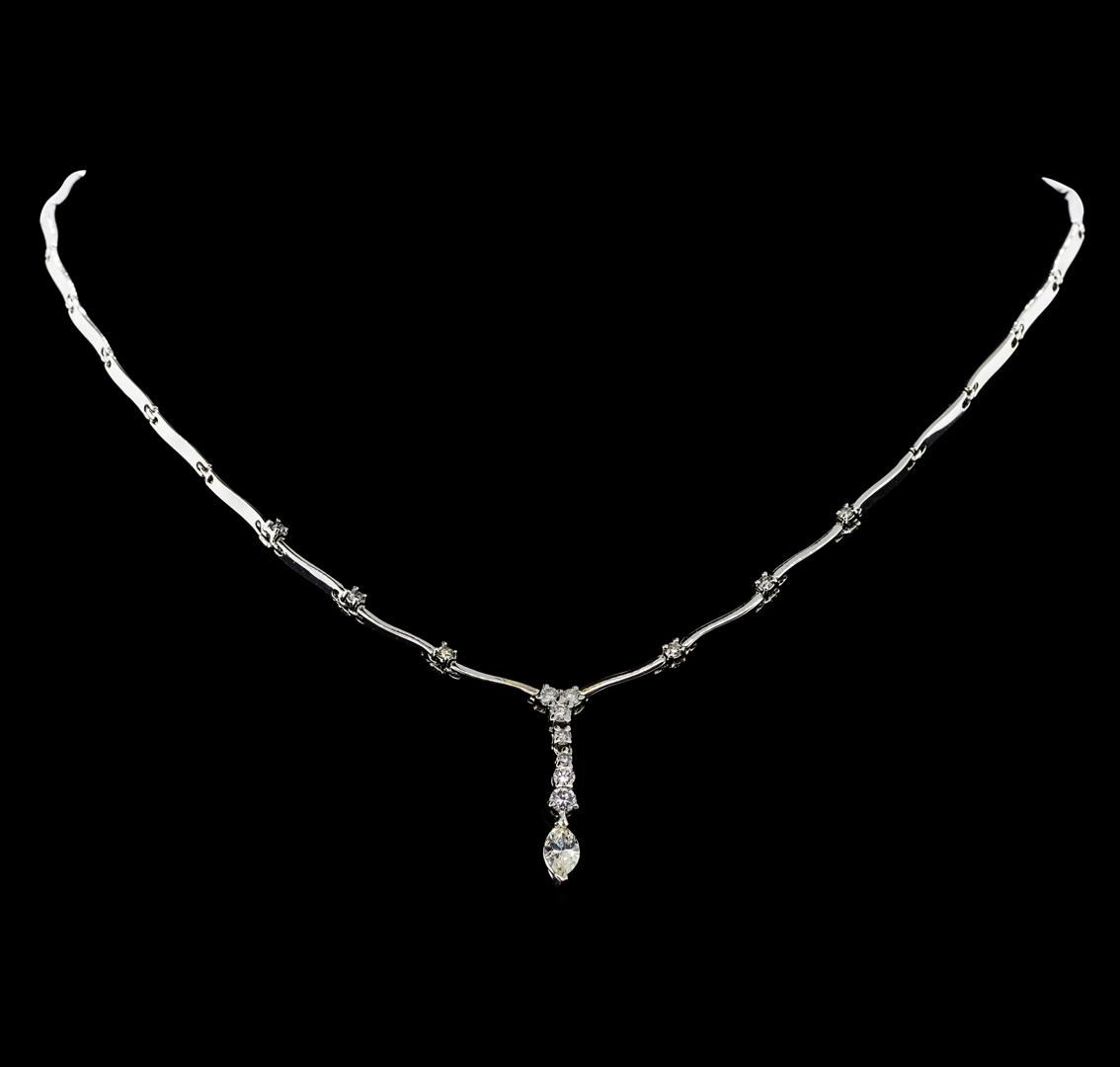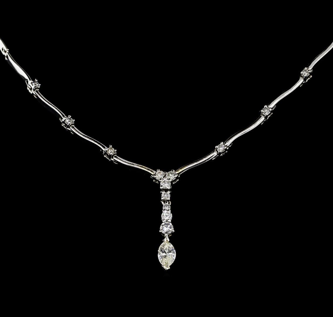 One electronically tested 14KT white gold lady's combination cast & assembled fashion necklace with a tongue clasp with foldover safety with a bright polish finish. The featured lady's necklace measures approximately 17.5 inches in length. Identified with markings of '14K'. Condition is new, good workmanship. Containing: One prong set marquise shaped cut diamond, measuring 7.10 x 4.50 x 3.00mm (depth est.) approximate weight of 0.54ct. Graded in the setting. Color J - K Clarity SI-1 Cut Very Good Five prong set round brilliant cut diamonds, measuring 3.30 - 2.90 x 1.92mm (depth est.) approximate total weight of 5 Stones = 0.46ct. Graded in the setting. Color H - I Clarity SI-2 to I-1 Cut Good Eight prong set round brilliant cut diamonds, measuring 2.10 - 2.05 x 1.29mm (depth est.) approximate total weight of 8 Stones = 0.29ct. Graded in the setting. Color H - I Clarity SI-2 to I-1 Cut Good. Total Weight of Diamonds 1.29ct.. Total Weight of Necklace 14.50gm GAS Appraised at $5375.00. GAS Appraised at $5,375.00.