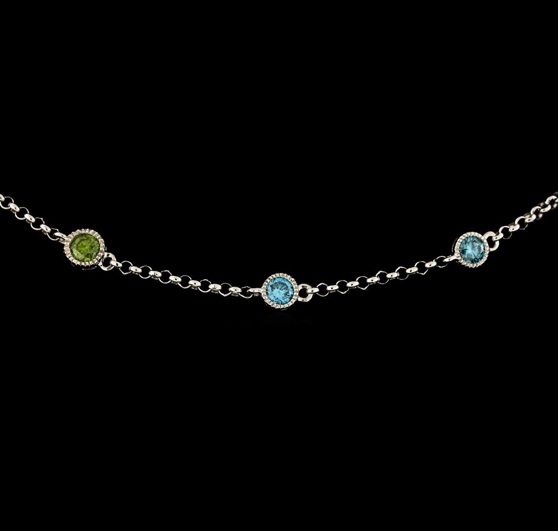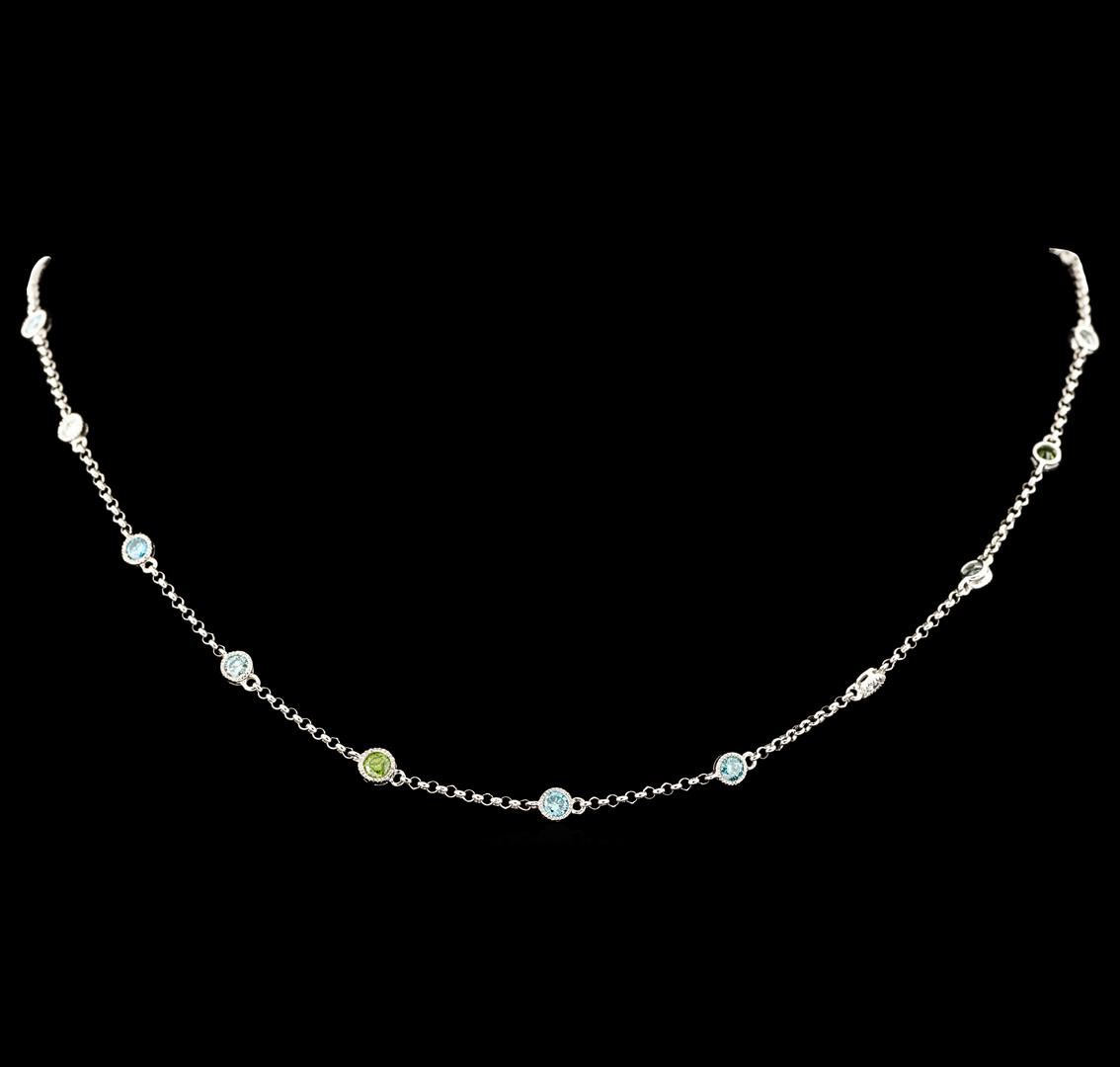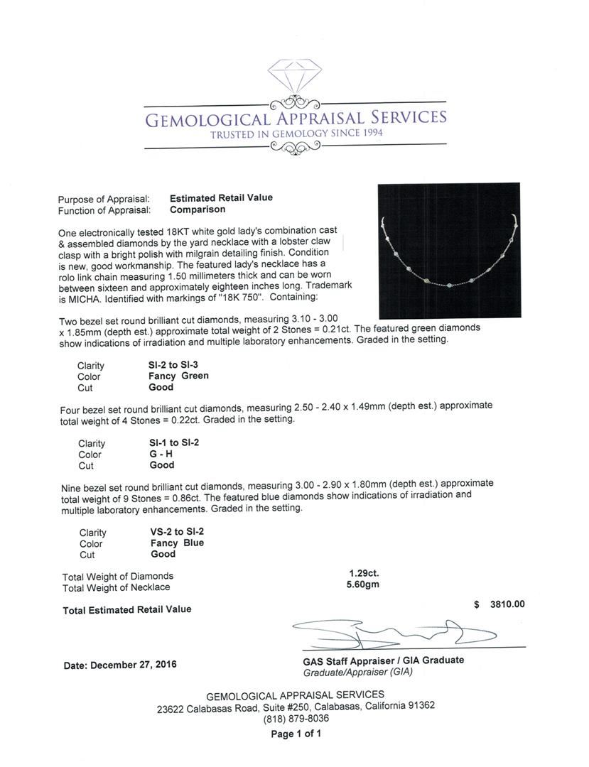 One electronically tested 18KT white gold lady's combination cast & assembled diamonds by the yard necklace with a lobster claw clasp with a bright polish with milgrain detailing finish. The featured lady's necklace has a rolo link chain measuring 1.50 millimeters thick and can be worn between sixteen and approximately eighteen inches long. Trademark is MICHA. Identified with markings of '18K 750'. Condition is new, good workmanship. Containing: Two bezel set round brilliant cut diamonds, measuring 3.10 - 3.00 x 1.85mm (depth est.) approximate total weight of 2 Stones = 0.21ct. The featured green diamonds show indications of irradiation and multiple laboratory enhancements. Graded in the setting. Clarity SI-2 to SI-3 Cut Good Four bezel set round brilliant cut diamonds, measuring 2.50 - 2.40 x 1.49mm (depth est.) approximate total weight of 4 Stones = 0.22ct. Graded in the setting. Clarity SI-1 to SI-2. Color: G - H Cut Good Nine bezel set round brilliant cut diamonds, measuring 3.00 - 2.90 x 1.80mm (depth est.) approximate total weight of 9 Stones = 0.86ct. The featured blue diamonds show indications of irradiation and multiple laboratory enhancements. Graded in the setting. Clarity VS-2 to SI-2 Cut Good. Total Weight of Diamonds 1.29ct.. Total Weight of Necklace 5.60gm. GAS Appraised at $3,810.00.