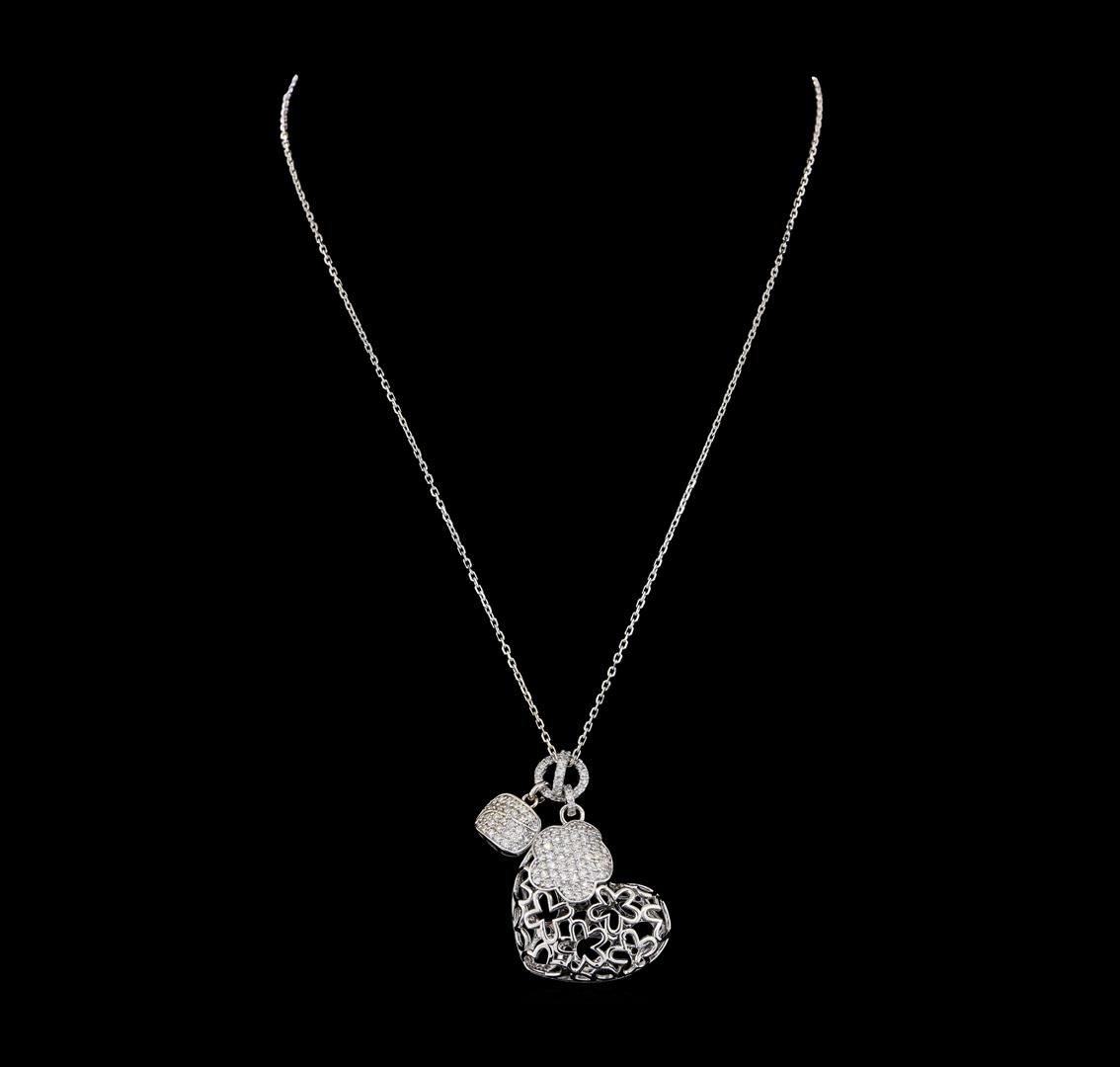 One electronically tested 14KT white gold lady's combination cast & assembled heart shape pendant & chain 16.0' long, 1.2mm diamond cut cable link with a lobster claw clasp with a bright polish finish. The featured lady's pendant has a puffed heart shaped motif composed of floral designs. Identified with markings of '14K'. Condition is new, good workmanship. Containing: Eighty-Three prong set round brilliant cut diamonds, measuring 1.50 - 1.45 x 0.92mm (depth est.) approximate total weight of 83 Stones = 1.02ct. Graded in the setting. Clarity SI-1 to SI-2. Color: H - I Cut Good Twenty-Nine prong set round brilliant cut diamonds, measuring 1.40 - 1.30 x 0.84mm (depth est.) approximate total weight of 29 Stones = 0.27ct. Graded in the setting. Clarity SI-1 to SI-2. Color: H - I Cut Good. Total Weight of Diamonds 1.29ct.. Total Weight of Pendant & Chain 10.50gm. GAS Appraised at $5,360.00.