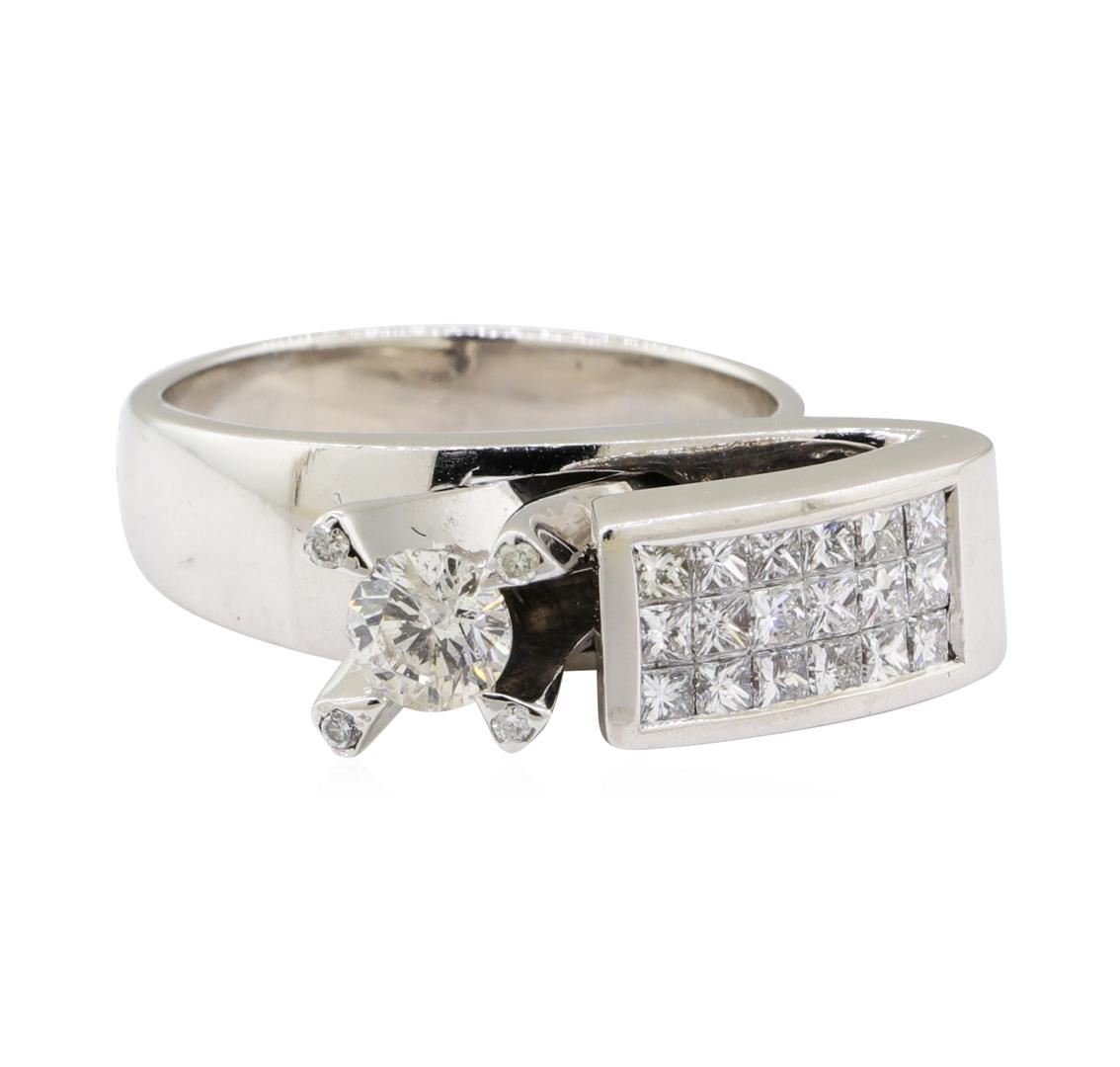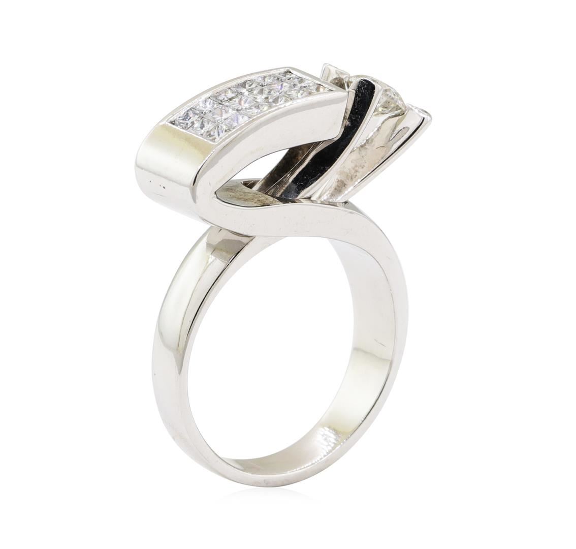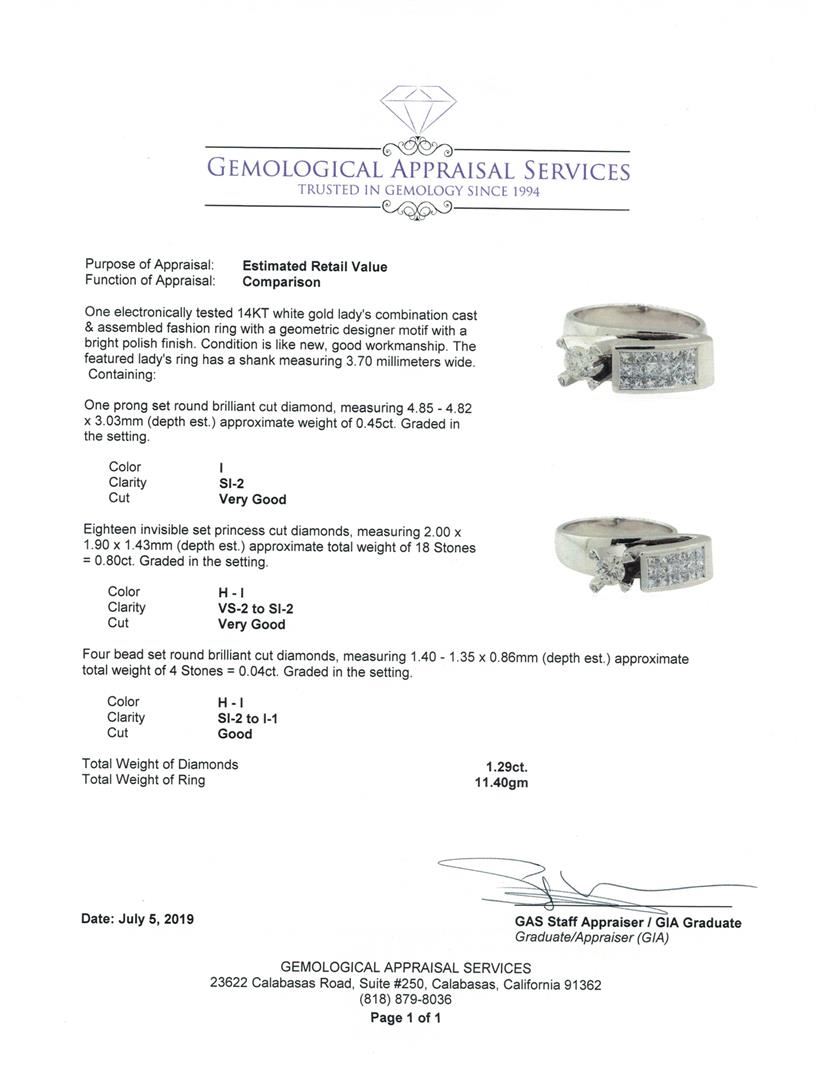 One electronically tested 14KT white gold lady's combination cast & assembled fashion ring with a geometric designer motif with a bright polish finish. The featured lady's ring has a shank measuring 3.70 millimeters wide. Condition is like new, good workm