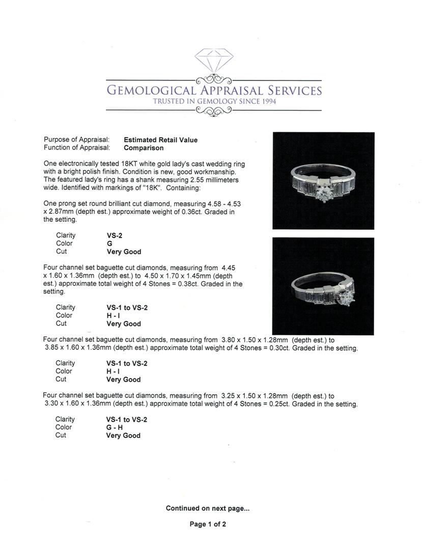 One electronically tested 18KT white gold lady's cast wedding ring with a bright polish finish. The featured lady's ring has a shank measuring 2.55 millimeters wide. Identified with markings of "18K". Condition is new, good workmanship. Containing: One prong set round brilliant cut diamond, measuring 4.58 - 4.53 x 2.87mm (depth est.) approximate weight of 0.36ct. Graded in the setting. Clarity: VS-2. Color: Very Good Four channel set baguette cut diamonds, measuring from 4.45 x 1.60 x 1.36mm (depth est.) to 4.50 x 1.70 x 1.45mm (depth est.) approximate total weight of 4 Stones = 0.38ct. Graded in the setting. Clarity: VS-1 to VS-2. Color: H - I. Cut Very Good Four channel set baguette cut diamonds, measuring from 3.80 x 1.50 x 1.28mm (depth est.) to 3.85 x 1.60 x 1.36mm (depth est.) approximate total weight of 4 Stones = 0.30ct. Graded in the setting. Clarity: VS-1 to VS-2. Color: H - I. Cut Very Good Four channel set baguette cut diamonds, measuring from 3.25 x 1.50 x 1.28mm (depth est.) to 3.30 x 1.60 x 1.36mm (depth est.) approximate total weight of 4 Stones = 0.25ct. Graded in the setting. Clarity: VS-1 to VS-2. Color: G - Very Good. Total Weight of Diamonds 1.29ct. Total Weight of Ring 4.90gm. GAS Appraised at $6,165.00.