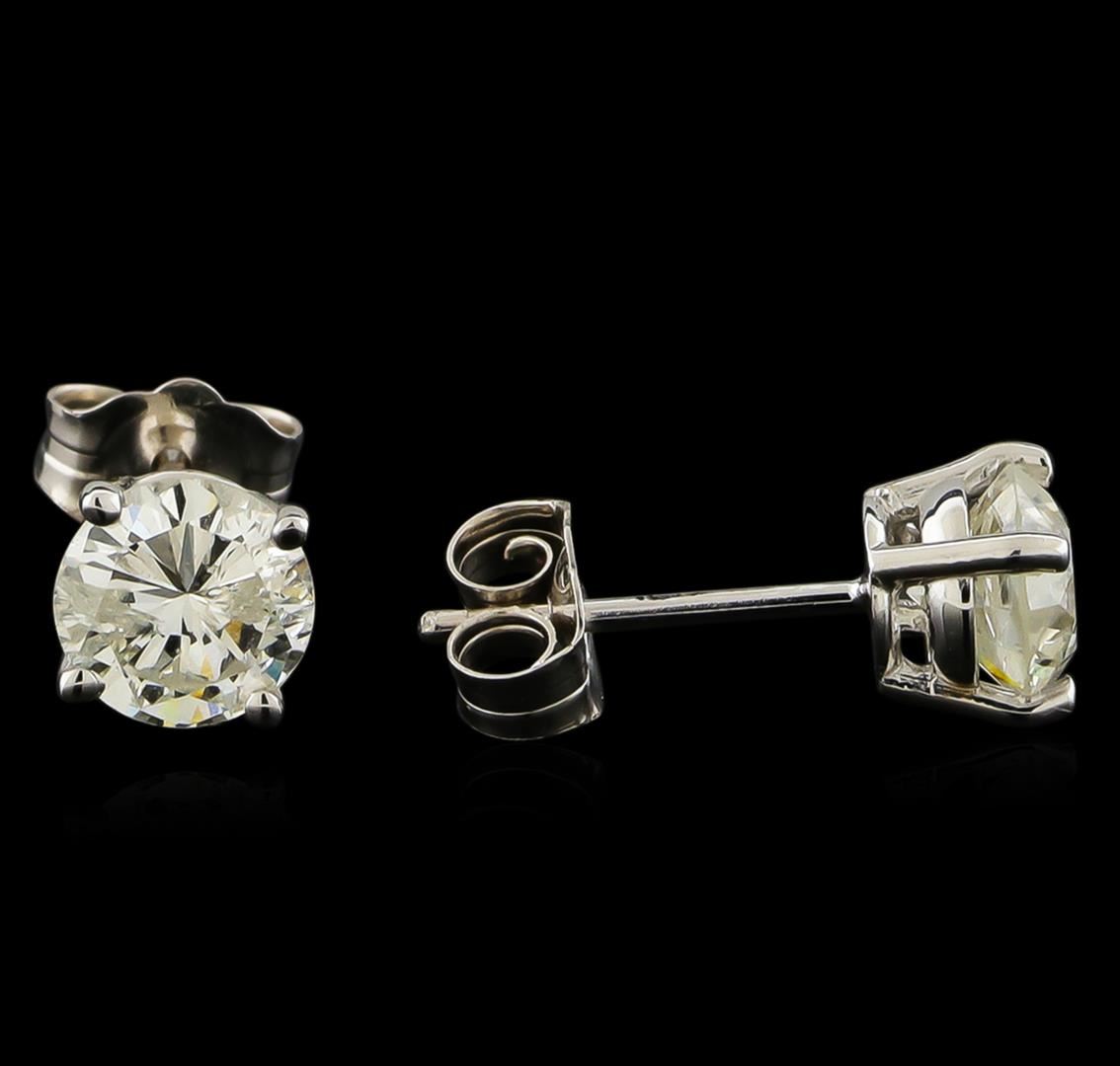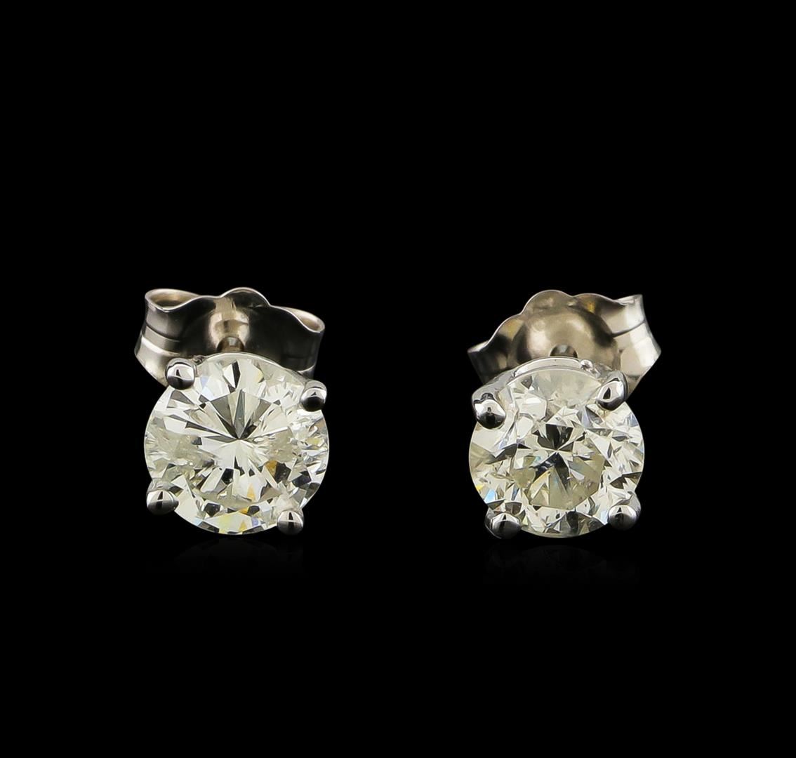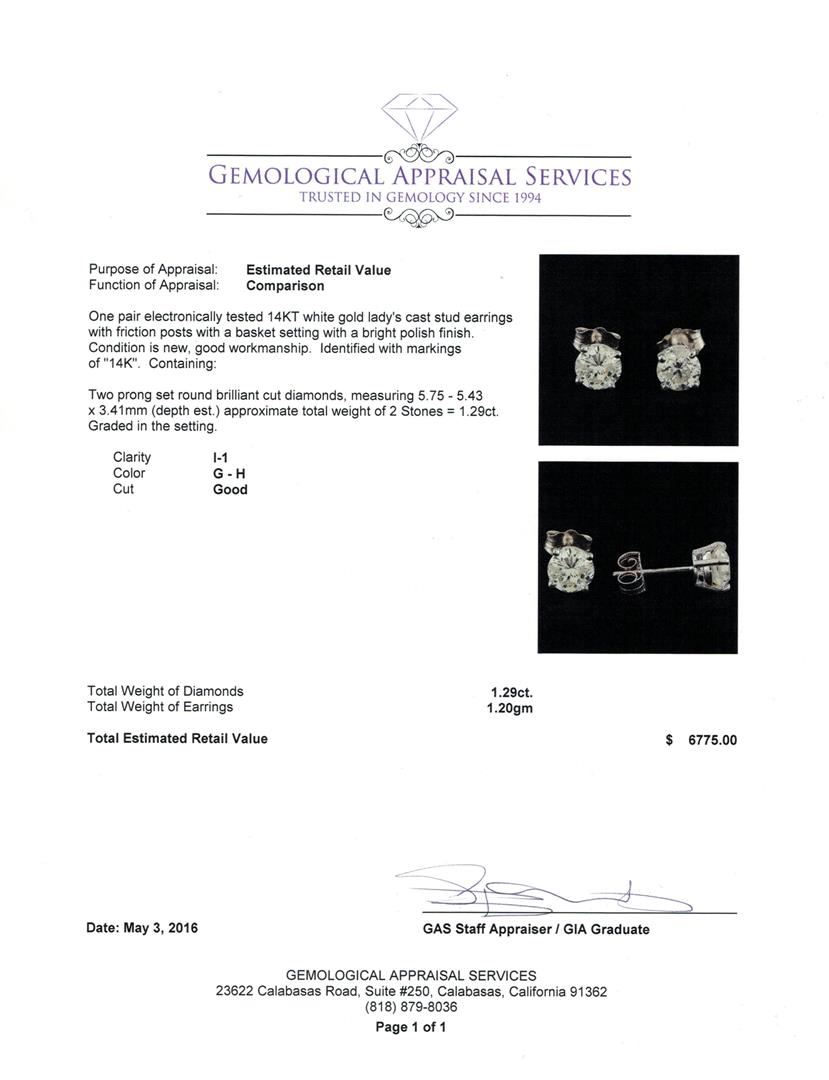 One pair electronically tested 14KT white gold lady's cast stud earrings with friction posts with a basket setting with a bright polish finish. Identified with markings of "14K". Condition is new, good workmanship. Containing: Two prong set round brilliant cut diamonds, measuring 5.75 - 5.43 x 3.41mm (depth est.) approximate total weight of 2 Stones = 1.29ct. Graded in the setting. Clarity: I-1. Color: G - Good. Total Weight of Diamonds 1.29ct. Total Weight of Earrings 1.20gm GAS Appraised at $6,775.00.
