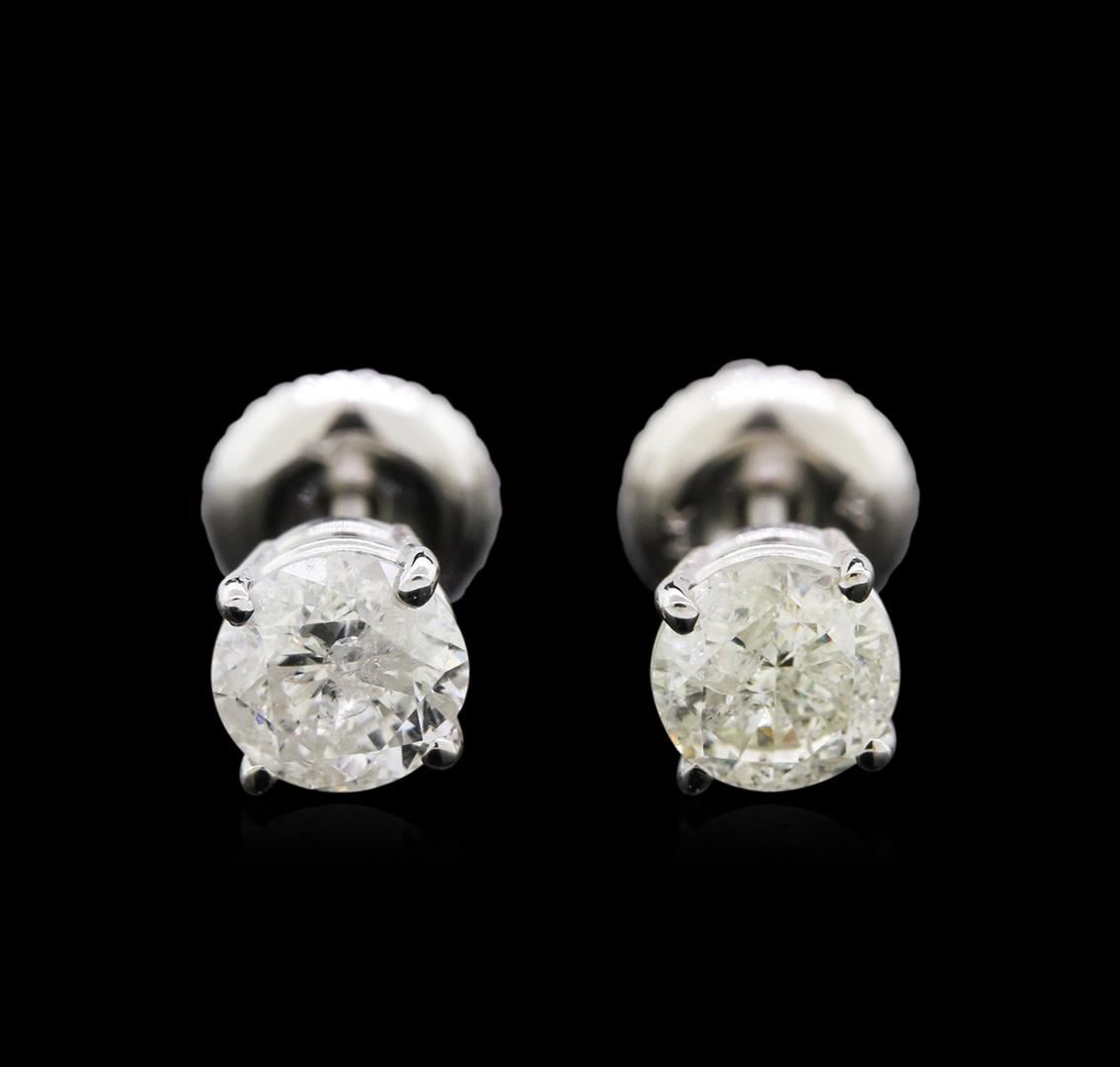 One pair electronically tested 14KT white gold lady's combination cast & assembled stud earrings with threaded posts and screw-on/screw-off backs with a basket setting with a bright polish finish. Identified with markings of "14K". Condition is new, good workmanship. Containing: Two prong set round brilliant cut diamonds, measuring 5.47 - 5.35 x 3.52mm (depth est.) approximate total weight of 2 Stones = 1.29ct. Graded in the setting. Clarity: I-1 to I-2. Color: H - I. Cut Good. Total Weight of Diamonds 1.29ct. Total Weight of Earrings 1.10gm. GAS Appraised at $5,760.00.