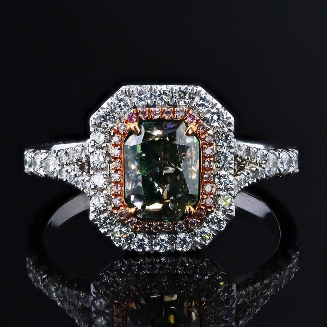 1.29ct Fancy Orange-Brown Diamond 18K White and Rose Gold Ring (1.72ctw Diamonds) GIA CERTIFIED. Eighteen karat (18K) two tone gold natural fancy color and colorless diamond ring. A natural fancy orange brown radiant cut diamond is mounted in the center of the ring. Colorless and natural fancy light pink round brilliant cut diamonds accent the ring around and on both sides of the center diamond. The ring has a gross weight of 4.8 Grams. Reference: GIA Colored Diamond Report 5201977402 NATURAL DIAMOND 1) CENTER DIAMOND SHAPE: Cut-Cornered Rectangular Modified Brilliant (Radiant Cut) QUANTITY: 1, Mounted Total WEIGHT: 1.29 carat total DIMENSIONS: 6.80 x 5.18 x 4.28mm GIRDLE: Medium to Extremely Thick, Faceted CULET: None CLARITY: SI2 COLOR: Natural, Fancy Orange-Brown, Even CUT: Excellent SYMMETRY: Very Good POLISH: Excellent FLUORESCENCE: None 2) DIAMOND SETTING SHAPE: Round Brilliant Cut WEIGHT: 0.43 carat total (Colorless-44pcs. Fancy Light Pink-28pcs.) DIMENSIONS: 1.8 x 1.0mm AVERAGE CLARITY: VS2 to SI1 AVERAGE COLOR: F - G (Colorless) Natural, Fancy Light Pink, Even SYMMETRY: Excellent POLISH: Excellent METAL METAL: Gold PURITY: 18K (750) COLOR: Two Tone (White & Rose) CONDITION: Excellent FINISH: High Polish