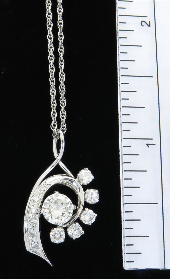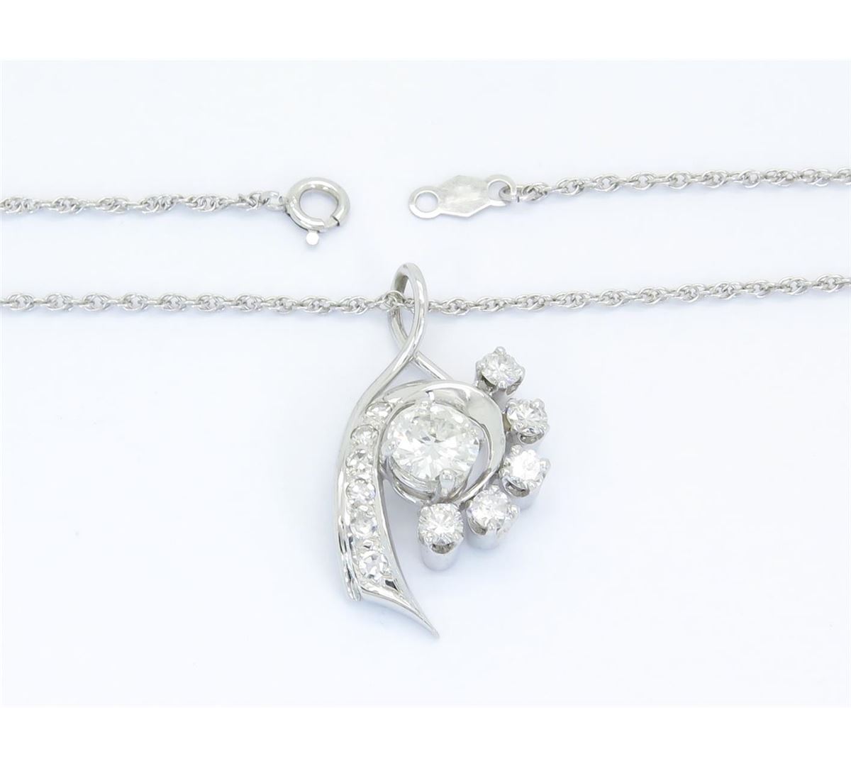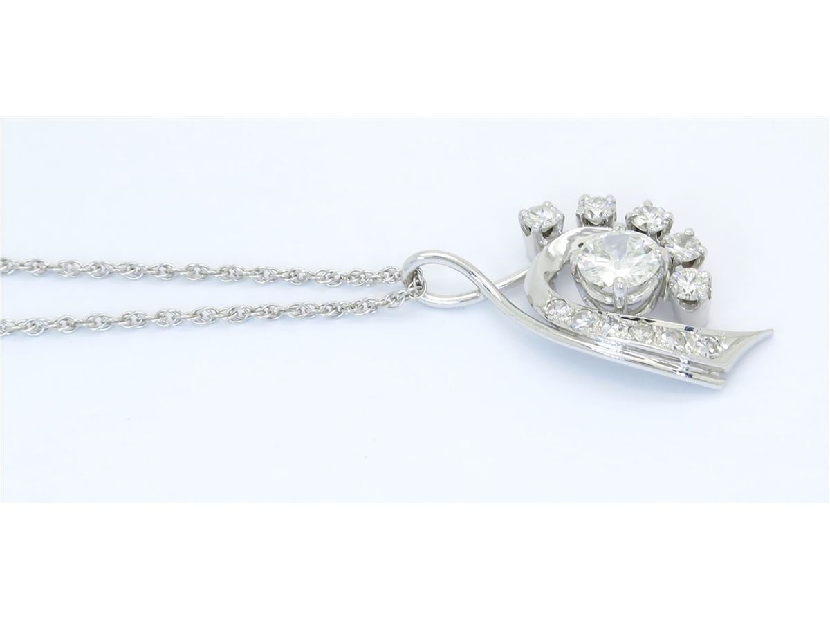 One tested 14K white gold diamond pendant. Condition is new. Containing: One .67CT Round Brilliant Cut Diamond. Clarity: VS1, Color: G-H. Five Round Brilliant Cut Diamonds, Six Single Cut Diamonds. Approximate total diamond weight: 1.29CTW. Diamonds are graded in the mounting, unless otherwise stated. Weight of necklace: 4.3 grams. Size of chain: 16" long.
