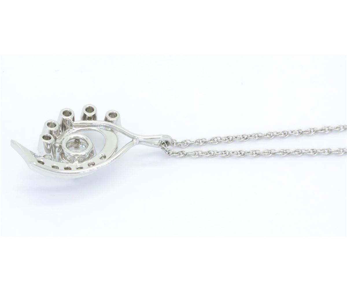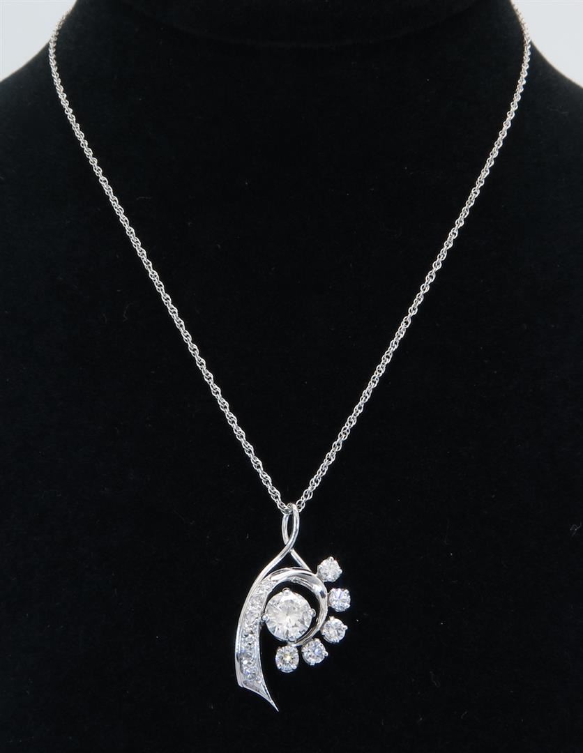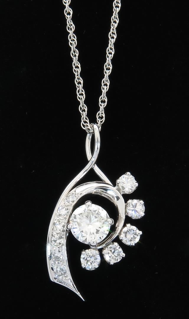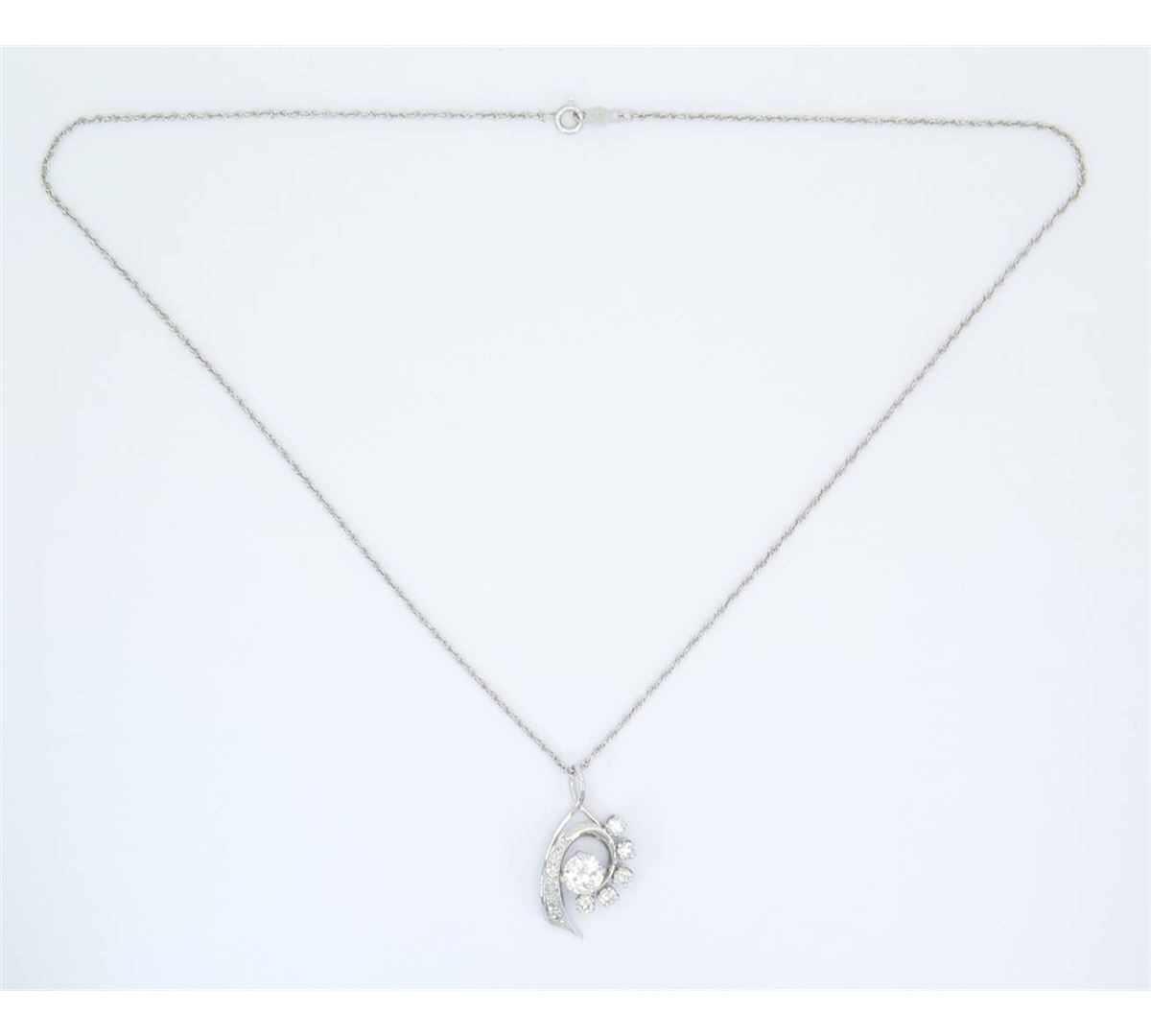One tested 14K white gold diamond pendant. Condition is new. Containing: One .67CT Round Brilliant Cut Diamond. Clarity: VS1, Color: G-H. Five Round Brilliant Cut Diamonds, Six Single Cut Diamonds. Approximate total diamond weight: 1.29CTW. Diamonds are graded in the mounting, unless otherwise stated. Weight of necklace: 4.3 grams. Size of chain: 16" long.
