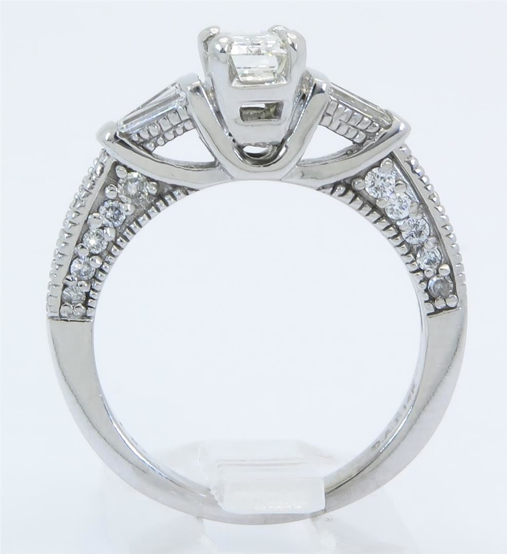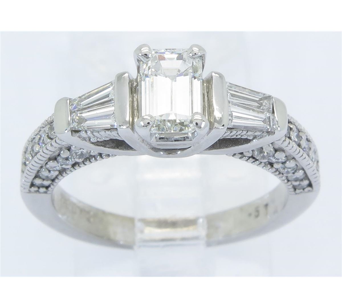 One tested 14K white gold diamond ring. Containing: One IGI Certified Emerald Cut Diamond, Size: .72CT, Clarity: VS1, Color: H. 30 Round Brilliant Cut Diamonds, 4 Tapered Baguette Cut Diamonds. Approximate total diamond weight: 1.29CTW. All diamonds are graded in the mounting unless otherwise stated. Weight of ring: 4.8 grams, Size: 5.25. IGI Appraised.
