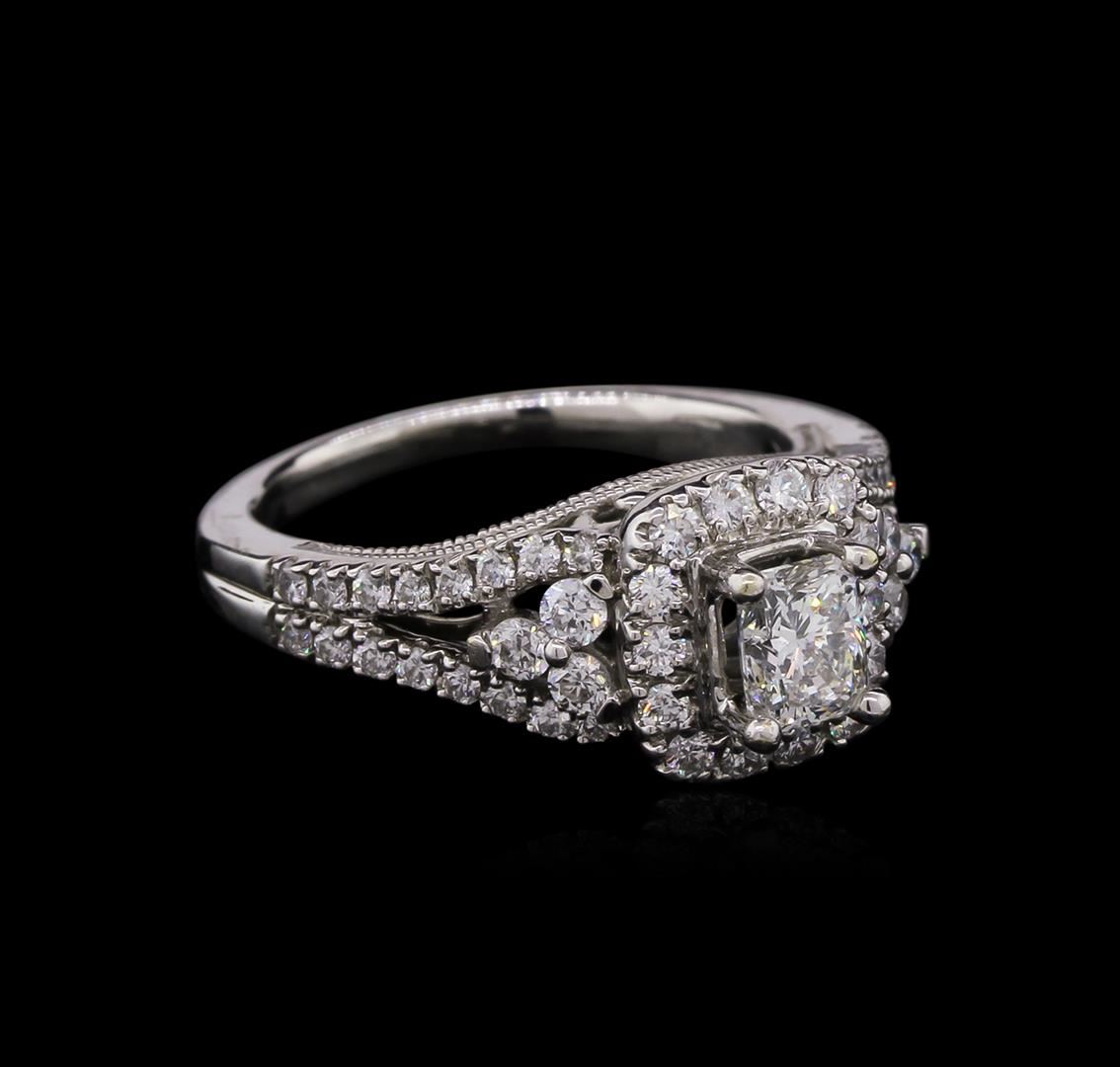One electronically tested 14KT white gold lady's cast split shank halo wedding ring with a bright polish finish. The featured lady's ring has a shank measuring 1.98 millimeters in width. Identified with markings of "14K". Condition is used, good workmanship. Containing: One prong set princess cut diamond, measuring 5.13 x 4.16 x 3.12mm (depth est.) approximate weight of 0.55ct. Graded in the setting. Clarity: SI-1. Color: Very Good Six prong set round brilliant cut diamonds, measuring 1.90 - 1.80 x 1.17mm (depth est.) approximate total weight of 6 Stones = 0.15ct. Graded in the setting. Clarity: VS-2 to SI-1. Color: G - Very Good Forty-Six prong set round brilliant cut diamonds, measuring 1.60 - 1.40 x 0.93mm (depth est.) approximate total weight of 46 Stones = 0.59ct. Graded in the setting. Clarity: SI-1 to SI-2. Color: G - I. Cut Good. Total Weight of Diamonds 1.29ct. Total Weight of Ring 5.20gm. GAS Appraised at $4,720.00.
