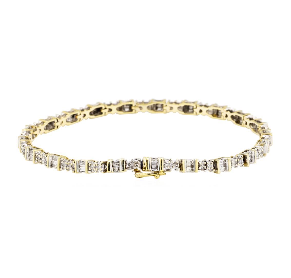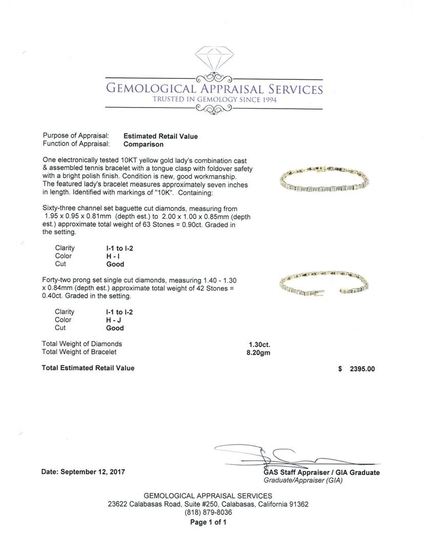 One electronically tested 10KT yellow gold lady's combination cast & assembled tennis bracelet with a tongue clasp with foldover safety with a bright polish finish. The featured lady's bracelet measures approximately seven inches in length. Identified with markings of '10K'. Condition is new, good workmanship. Containing: Sixty-Three channel set baguette cut diamonds, measuring from 1.95 x 0.95 x 0.81mm (depth est.) to 2.00 x 1.00 x 0.85mm (depth est.) approximate total weight of 63 Stones = 0.90ct. Graded in the setting. Color H - I Clarity I-1 to I-2 Cut Good Forty-Two prong set single cut diamonds, measuring 1.40 - 1.30 x 0.84mm (depth est.) approximate total weight of 42 Stones = 0.40ct. Graded in the setting. Color H - J Clarity I-1 to I-2 Cut Good. Total Weight of Diamonds 1.30ct.. Total Weight of Bracelet 8.20gm GAS Appraised at $2395.00. GAS Appraised at $2,395.00.